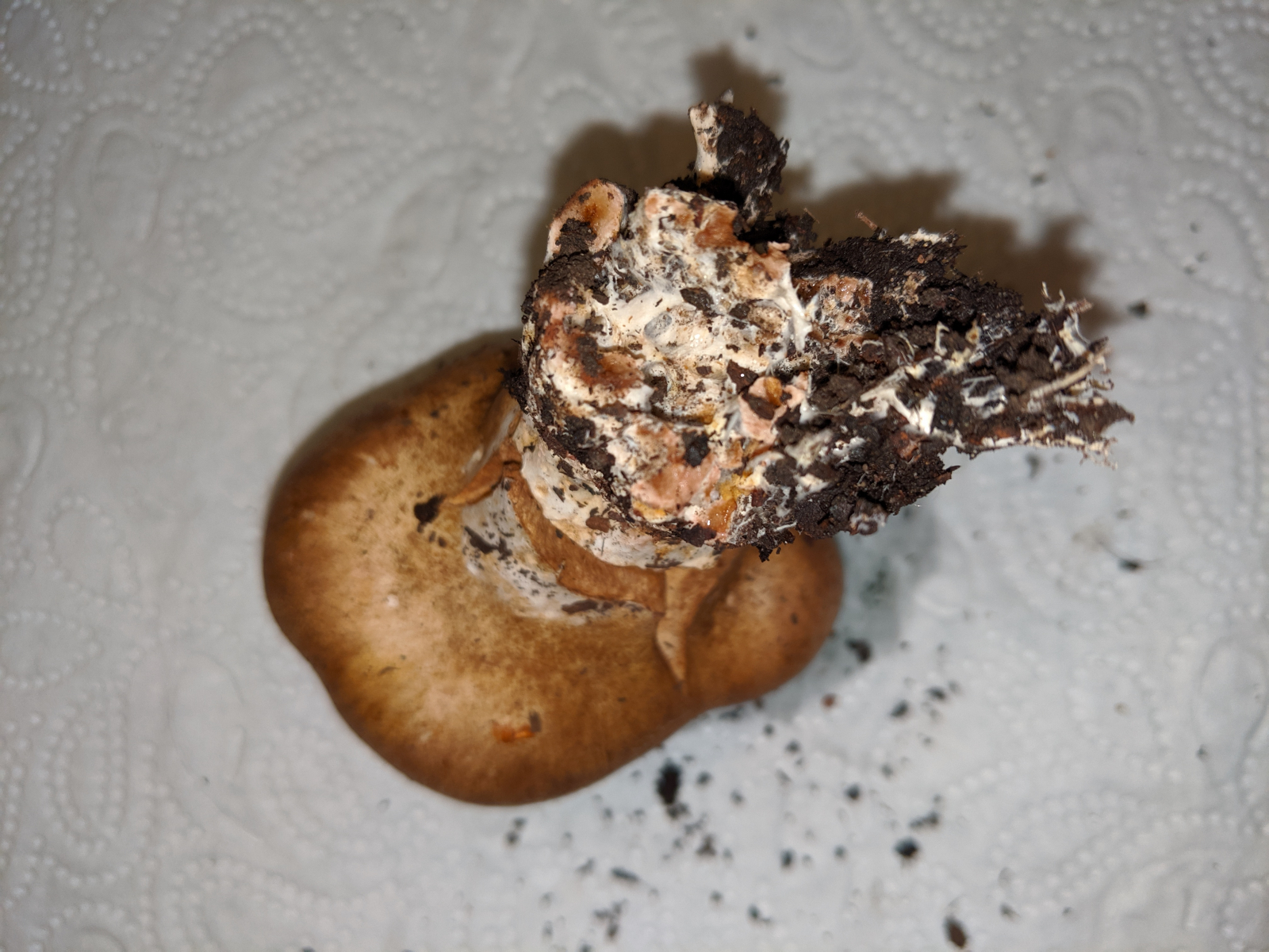 Die nächsten 4 Bilder einzeln stehender Pilz ebenfalls auf Rindenmulch unter Farn. Geruch leicht holzig.