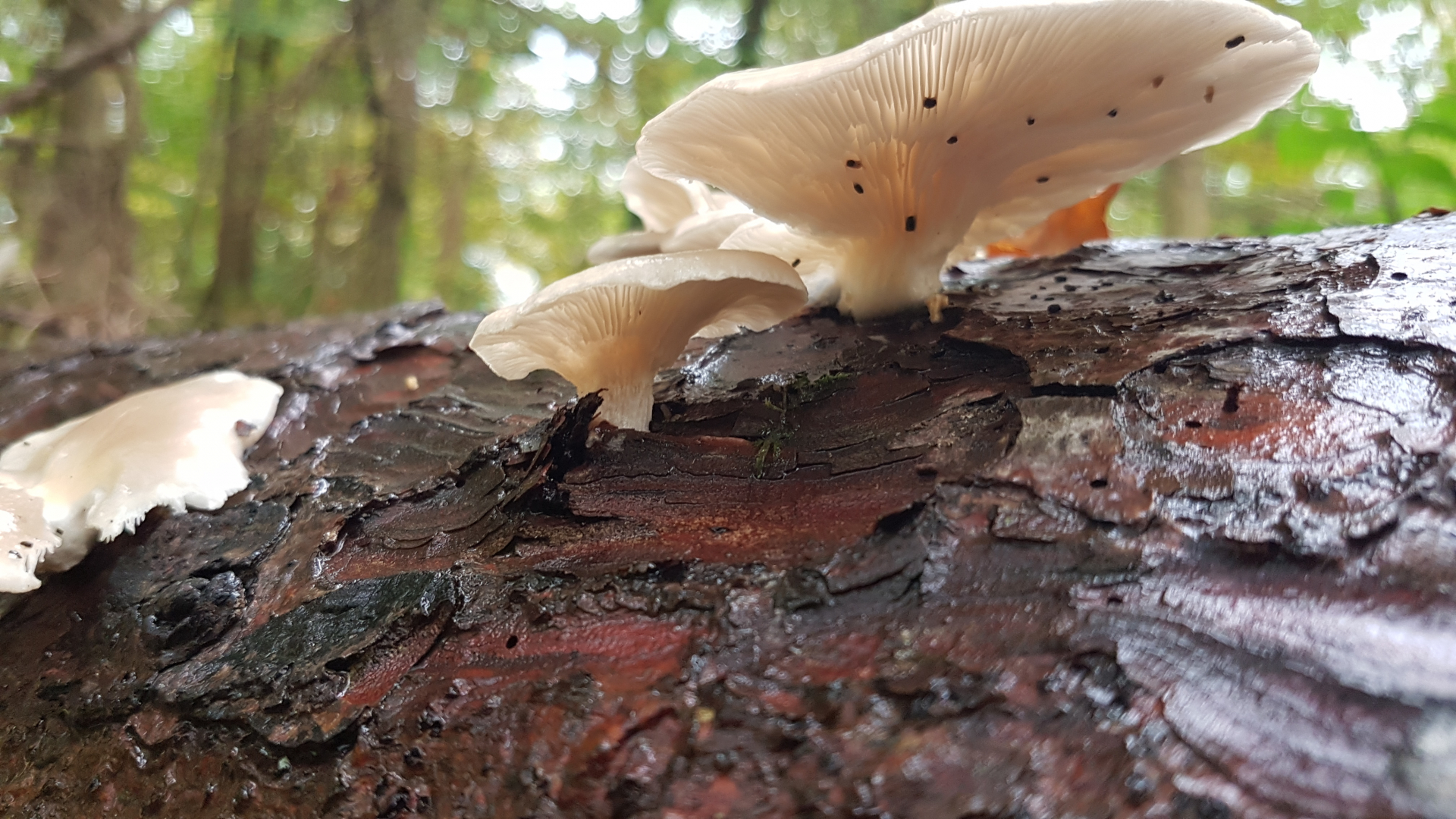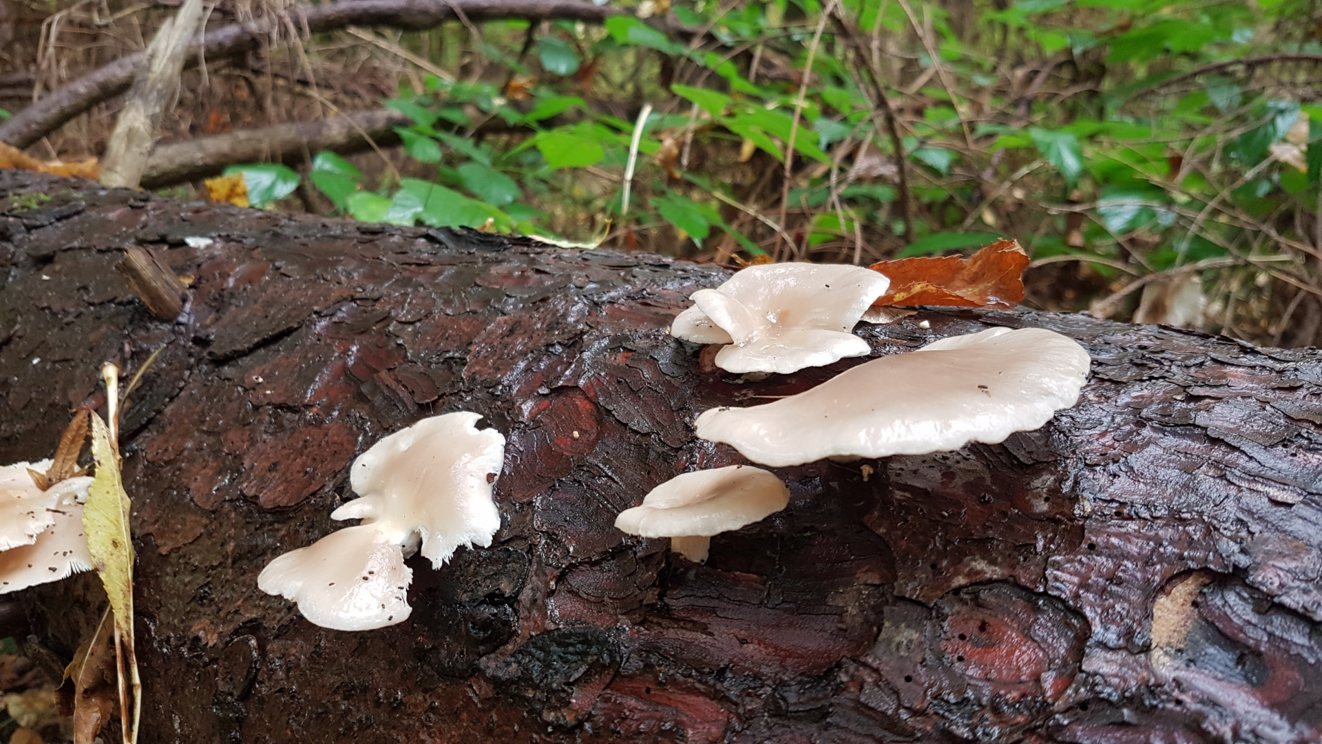 Mein erster Instinkt war Austernseitling, allerdings wuchsen sie vereinzelter als ich das sonst von ihnen kenne, und nicht auf Laubholz sondern einem Toten, noch nicht sehr Morschen Fichtenbaum.