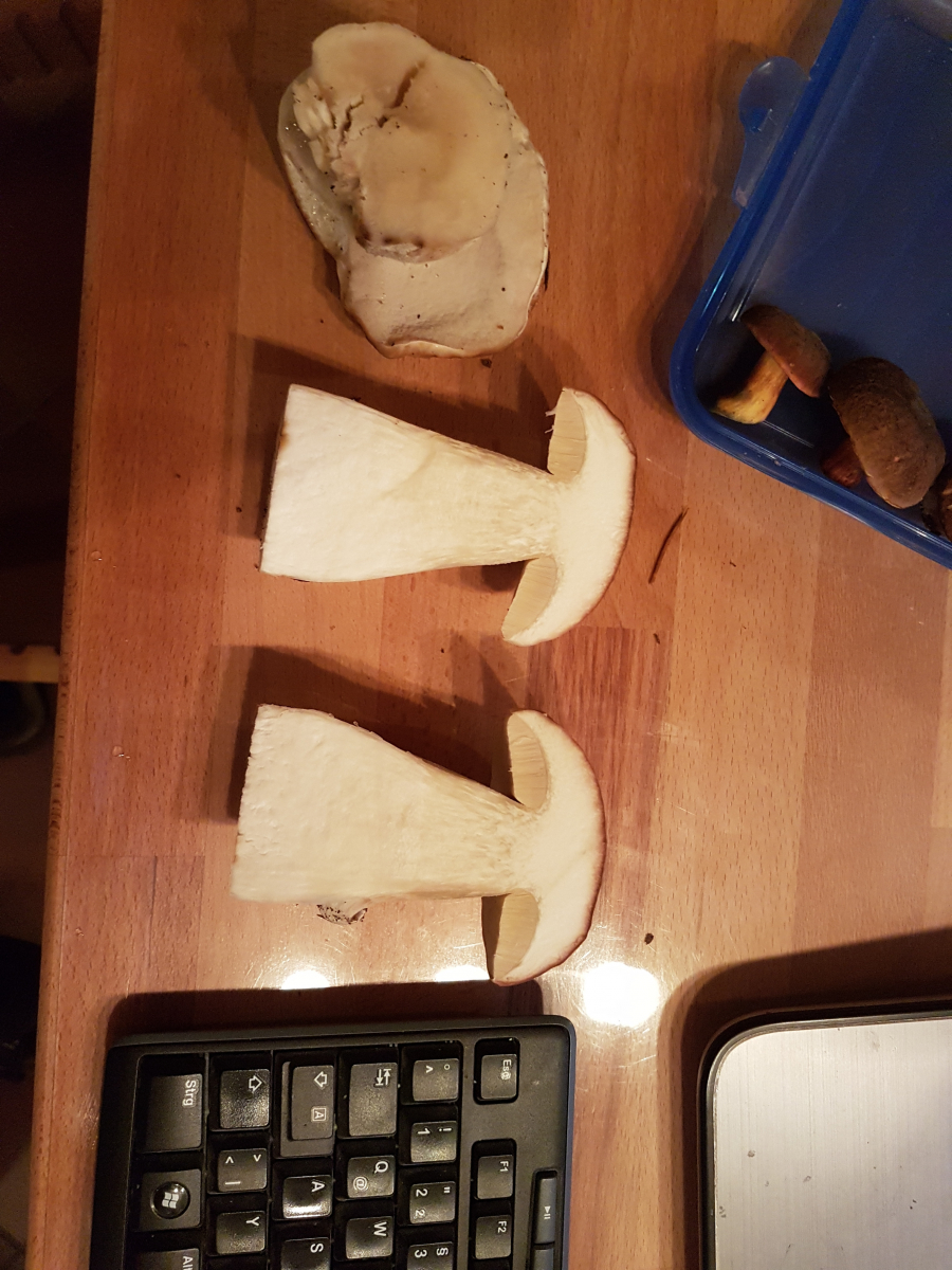 ich habe heute im Urlaub in Wingst nahe Cuxhaven unter anderem folgende zwei Pilze gefunden, ich vermute Steinpilze. Sie sind sehr fest und schwer, dazu ziemlich massiv. Der kleinere war gerade erst dabei, das Laub zu durchbrechen. Das sollten doch Steinpilze sein, oder?