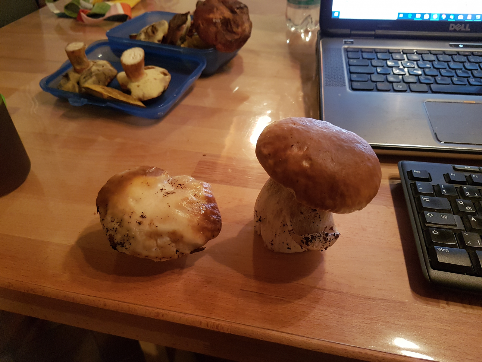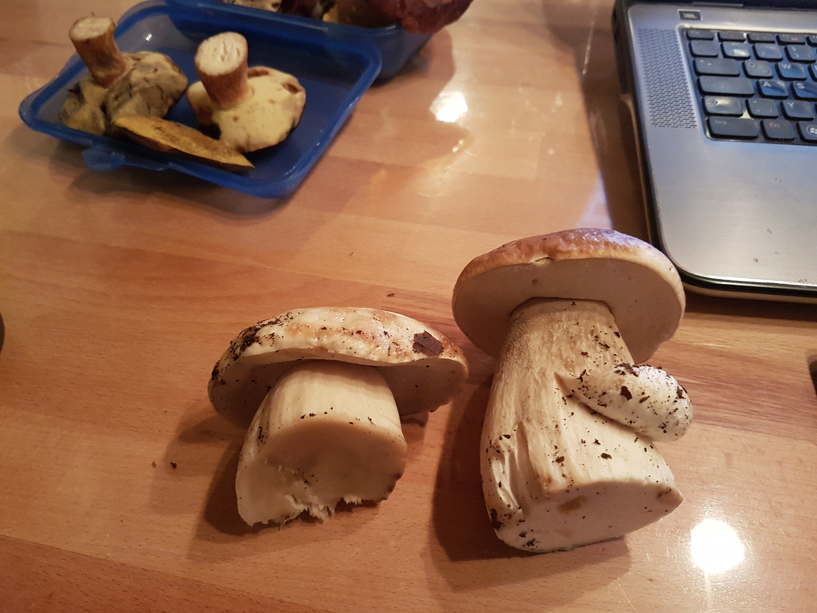 ich habe heute im Urlaub in Wingst nahe Cuxhaven unter anderem folgende zwei Pilze gefunden, ich vermute Steinpilze. Sie sind sehr fest und schwer, dazu ziemlich massiv. Der kleinere war gerade erst dabei, das Laub zu durchbrechen. Das sollten doch Steinpilze sein, oder?