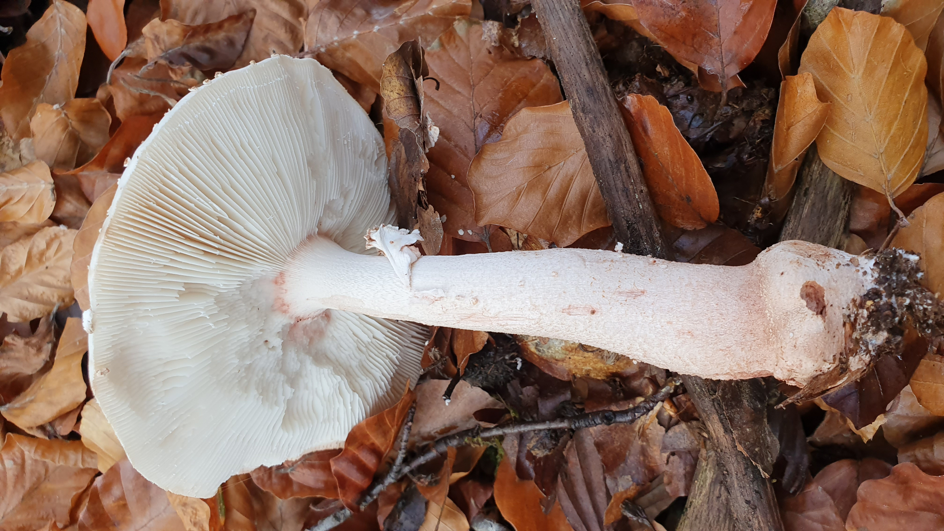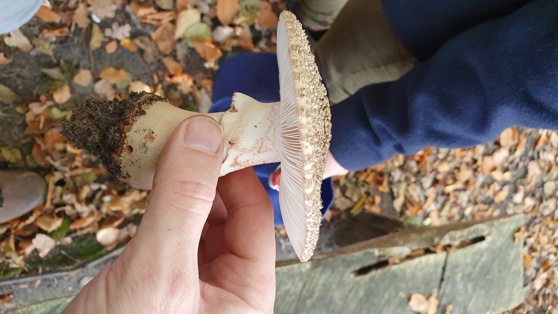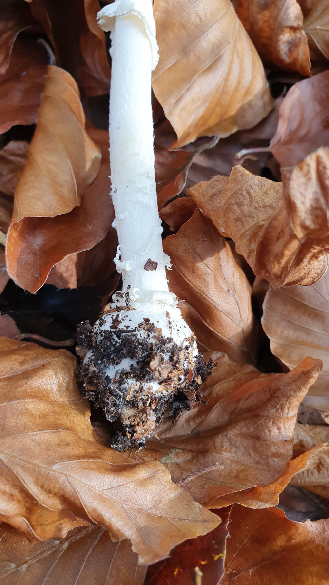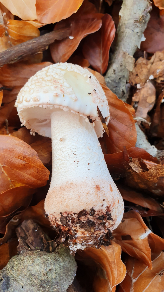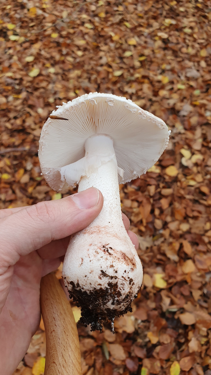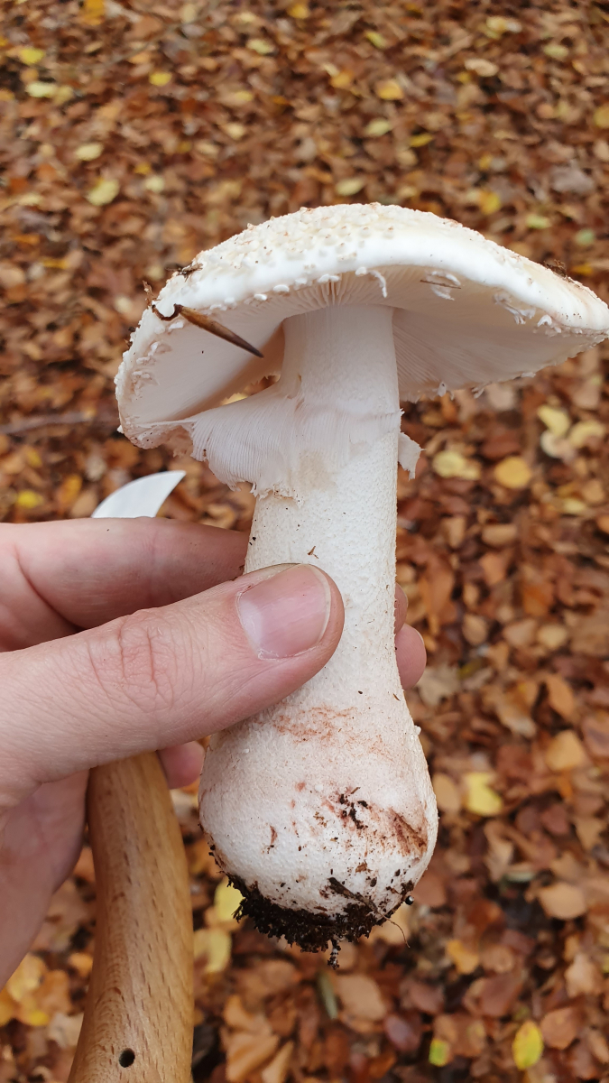 Ungerandete zwiebelförmige Knolle, geriefte Manschette, rötendes Fleisch, Perlen auf dem Hut...