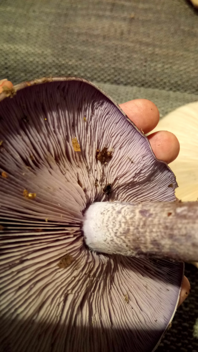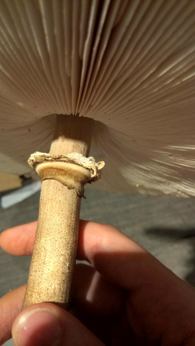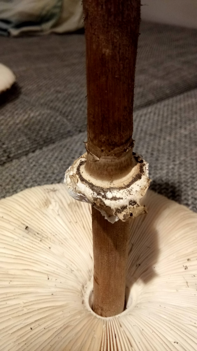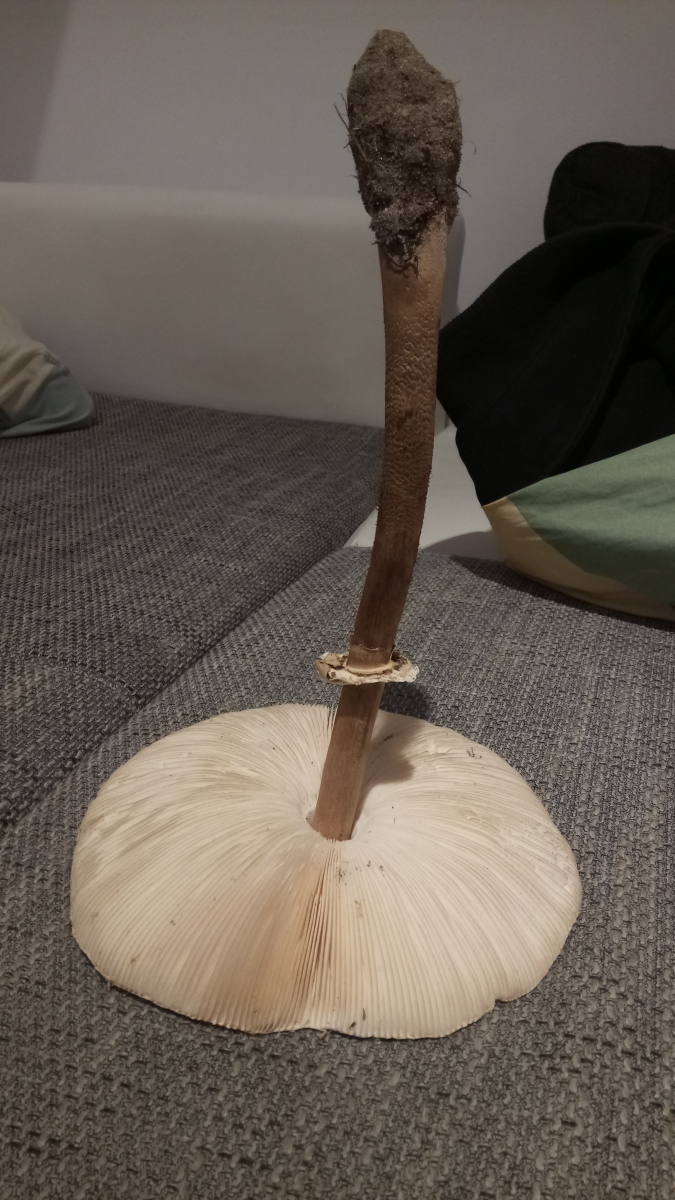 Den Safranschirmling leg ich weg, auch wenn dieser super riecht und der Ring sehr gut verschiebbar ist (nicht geklebt hat, wie beim Riesenschirmling unten) und eine filzige Knolle hat, sowie keine Natterung. Der Stiel hohl.
