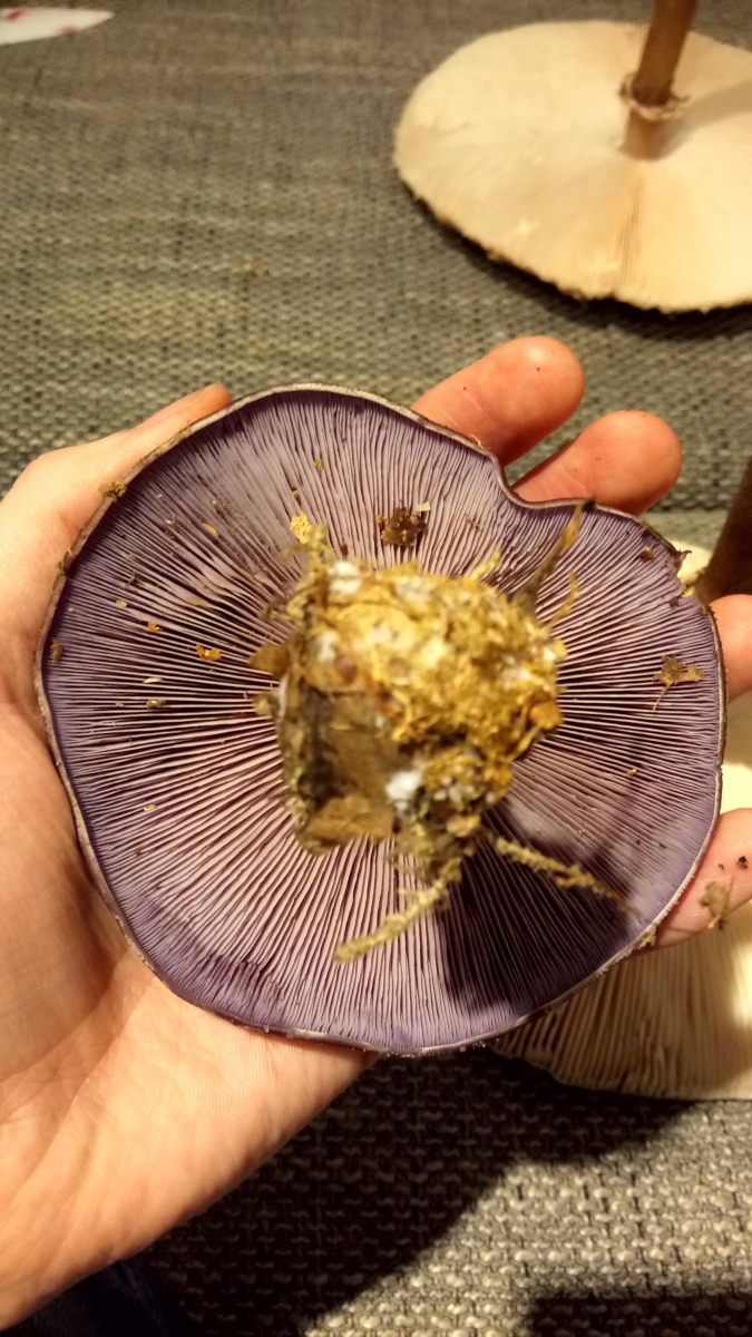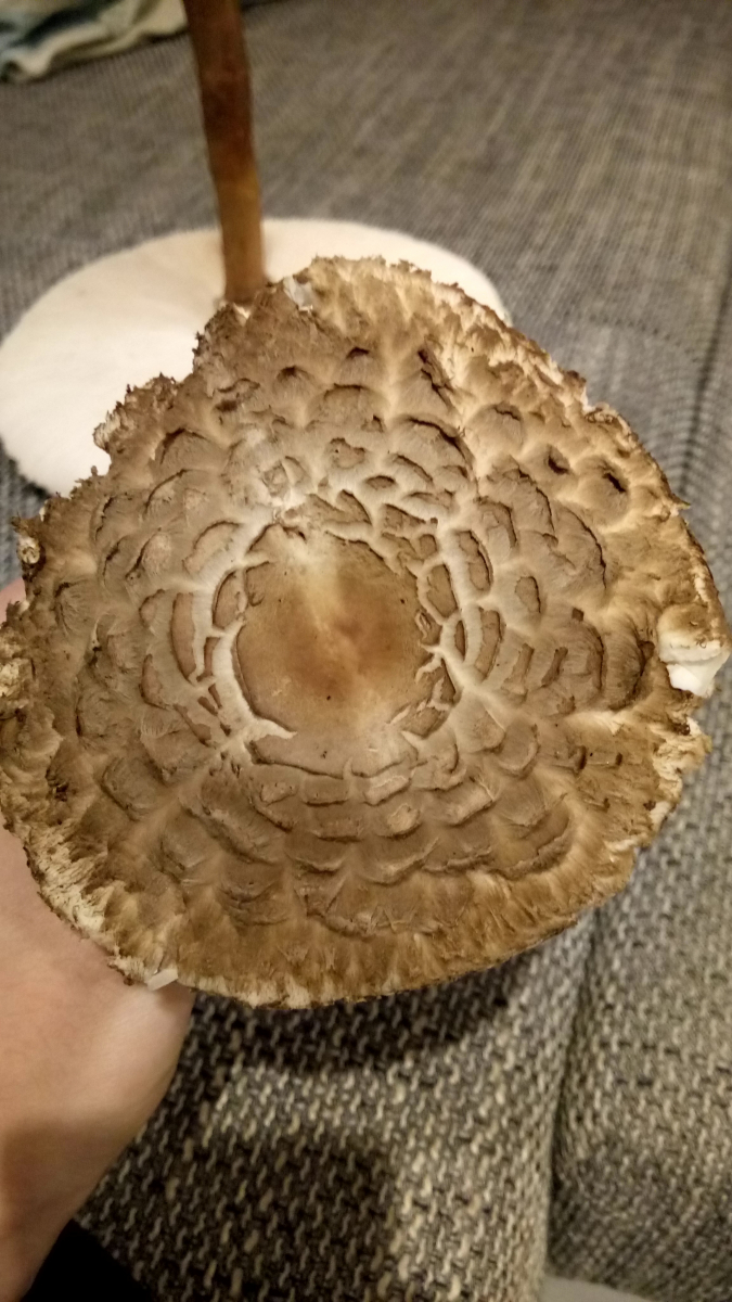 Den Safranschirmling leg ich weg, auch wenn dieser super riecht und der Ring sehr gut verschiebbar ist (nicht geklebt hat, wie beim Riesenschirmling unten) und eine filzige Knolle hat, sowie keine Natterung. Der Stiel hohl.