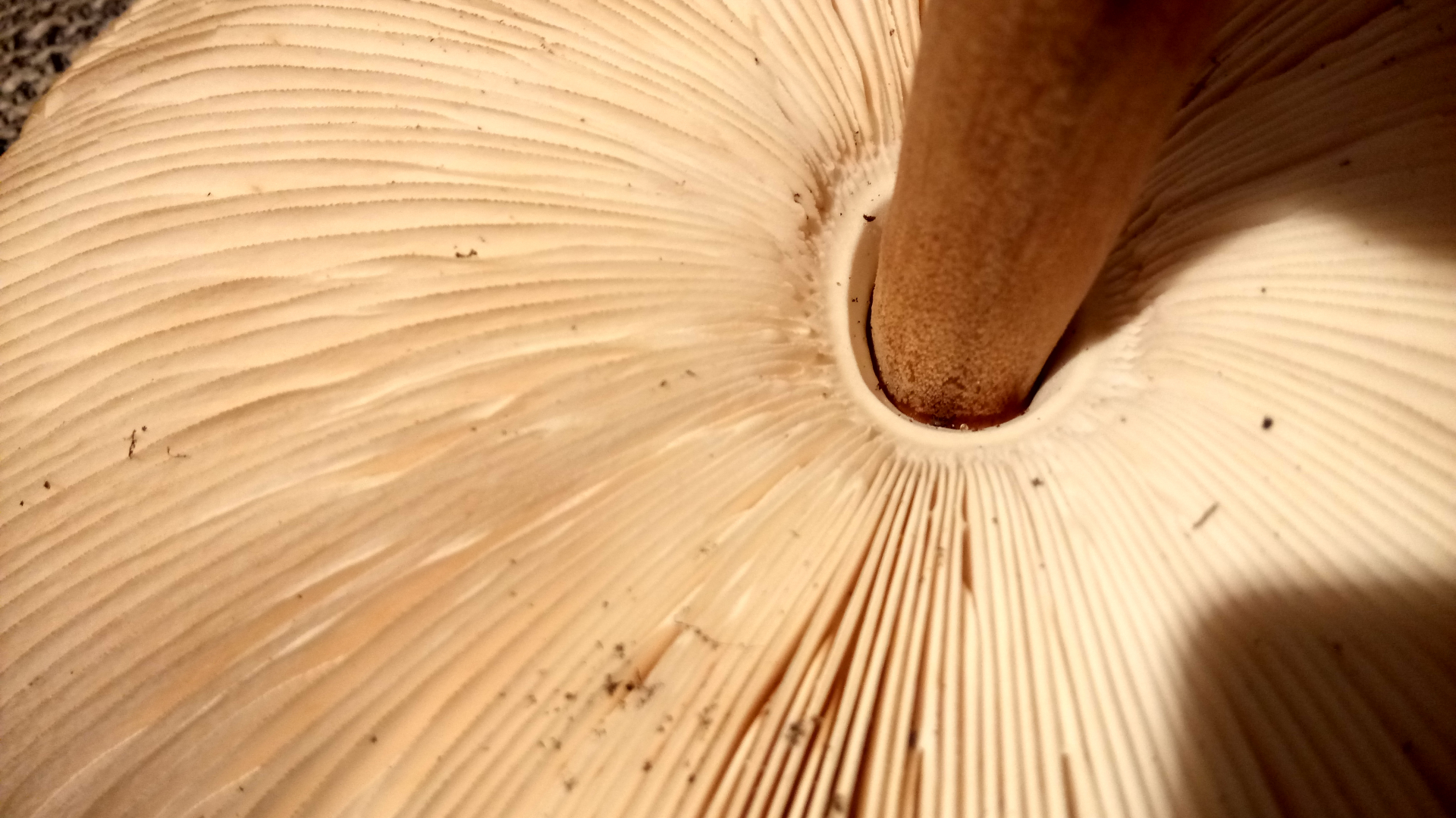 Nun zum riesigen Schirm: Seine Lamellen wachsen nicht zum Stiel an, sondern bilden ein Hohlkreis.