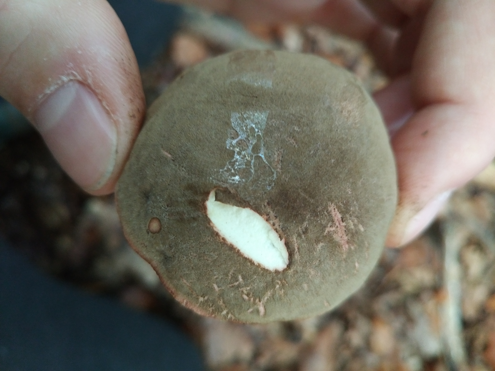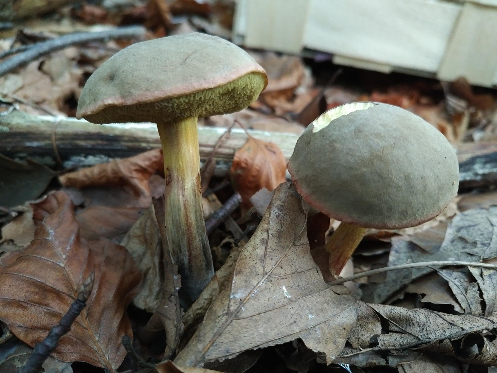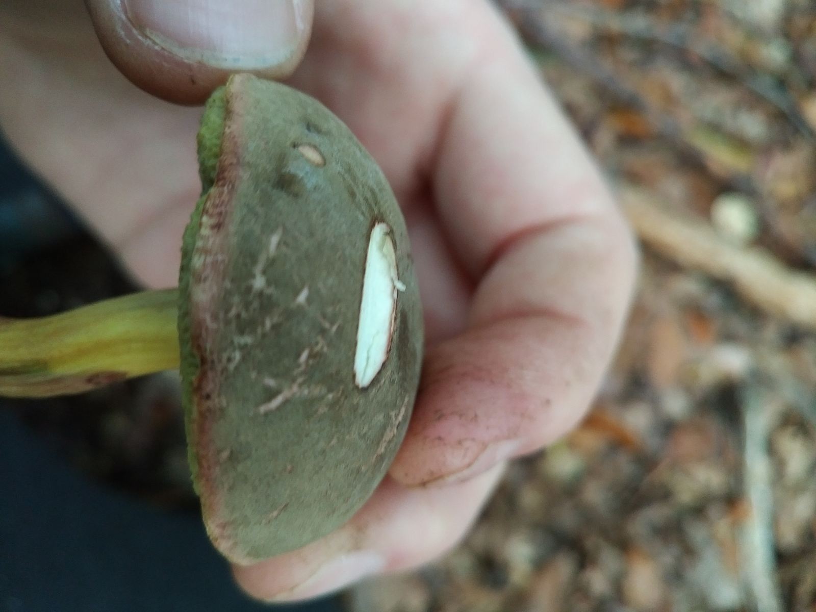 Pilz 3: Hier tippe ich auf einen der Rotfußröhrlinge. Hatte zuerst auch die Ziegenlippe in Betracht gezogen, aber die Farbe des Schwamms hat mich wieder zu den Rotfußröhrlingen gebracht.
