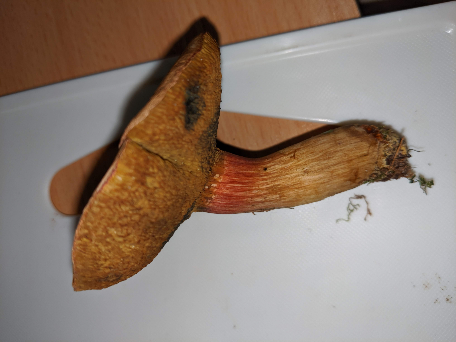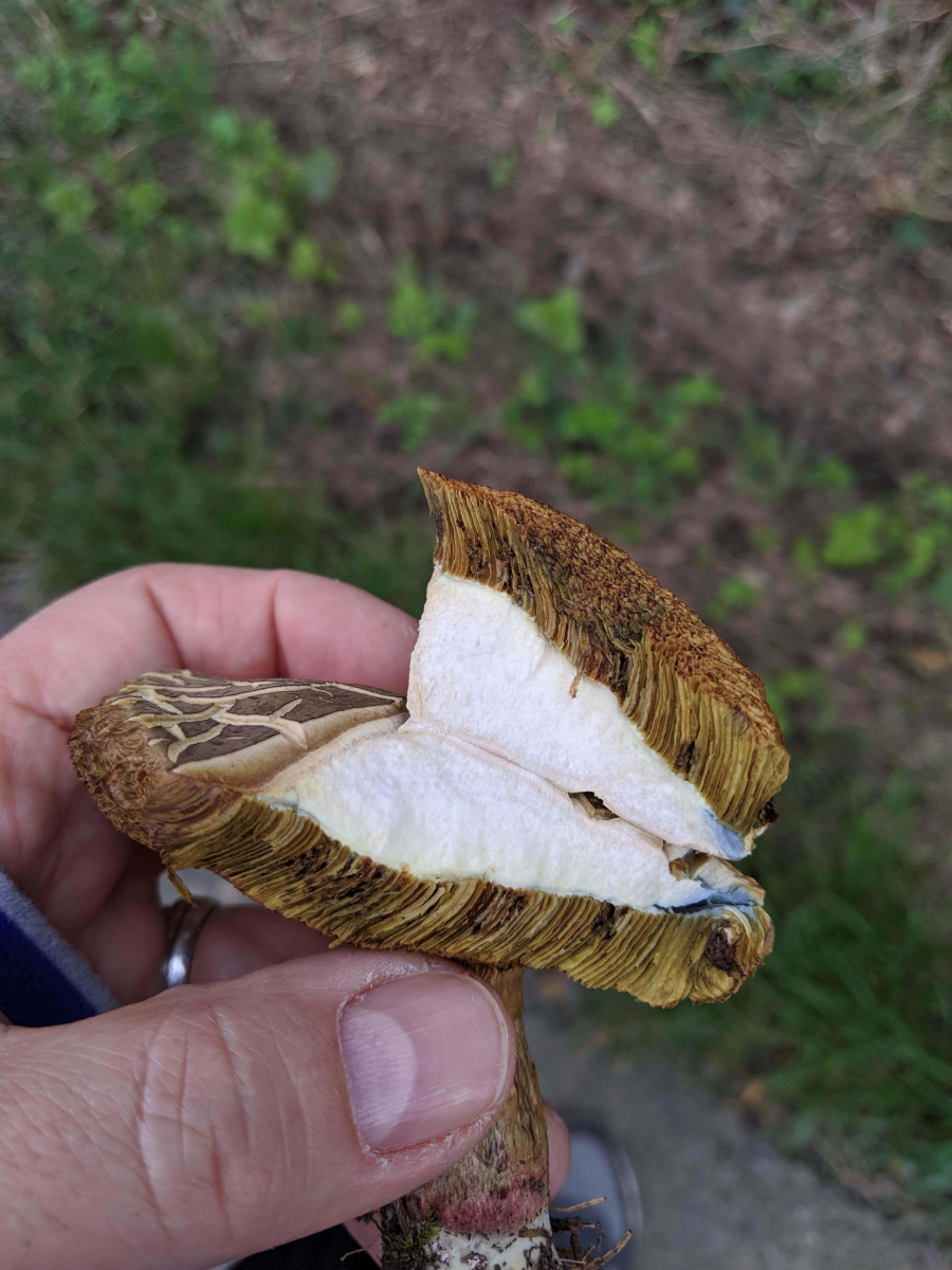 Pilz 3 - in direkter Nähe zu Pilz 2. Mich irritiert hier die starke Holzigkeit und das blau-färben, dass einen ganz anderen Verlauff als bei den anderen Röhrlingen aufweist. Geruch erdig.