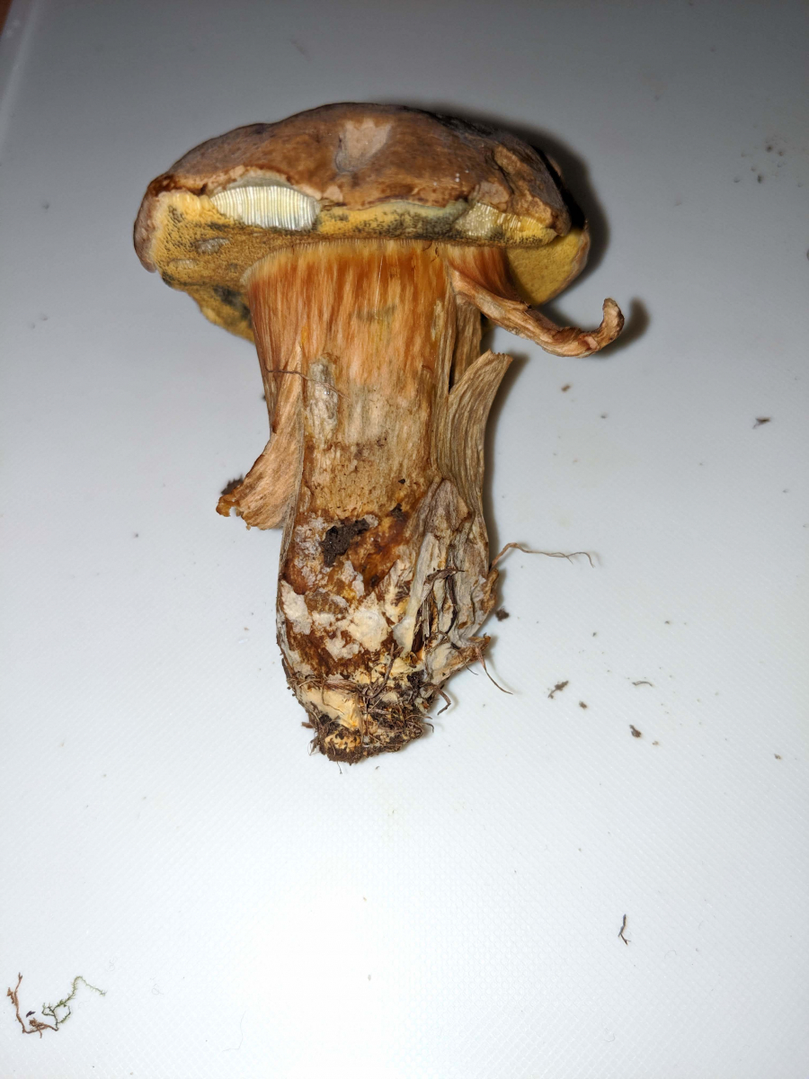 Pilz 3 - in direkter Nähe zu Pilz 2. Mich irritiert hier die starke Holzigkeit und das blau-färben, dass einen ganz anderen Verlauff als bei den anderen Röhrlingen aufweist. Geruch erdig.