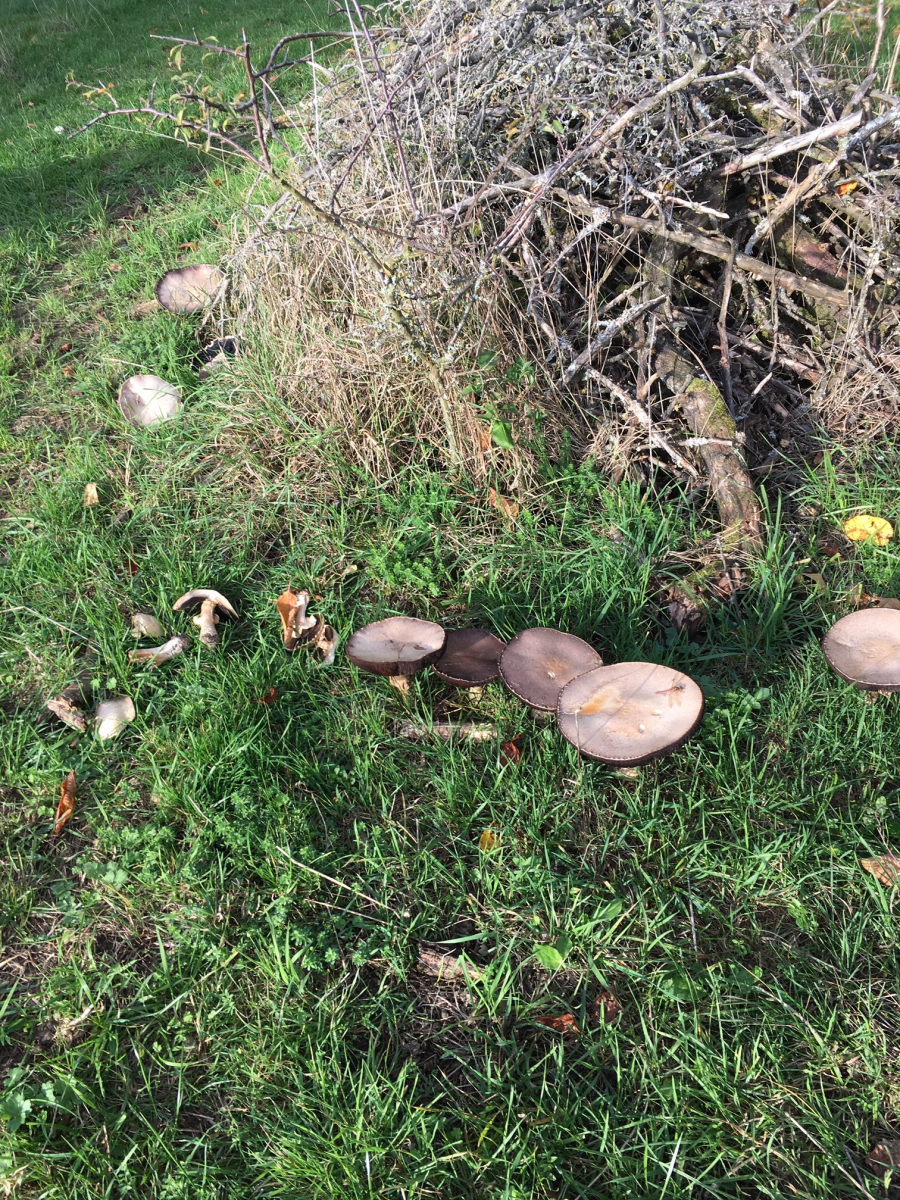 Schon von Weitem sah ich etwas auf einer Streuobstwiese, gruppiert um einen Haufen oller Äste, das zuerst wie alte Pappteller erschien. Schnell hab ich dann aber erkannt: Es müssen Pilze sein! ==Gnolm15 ==)