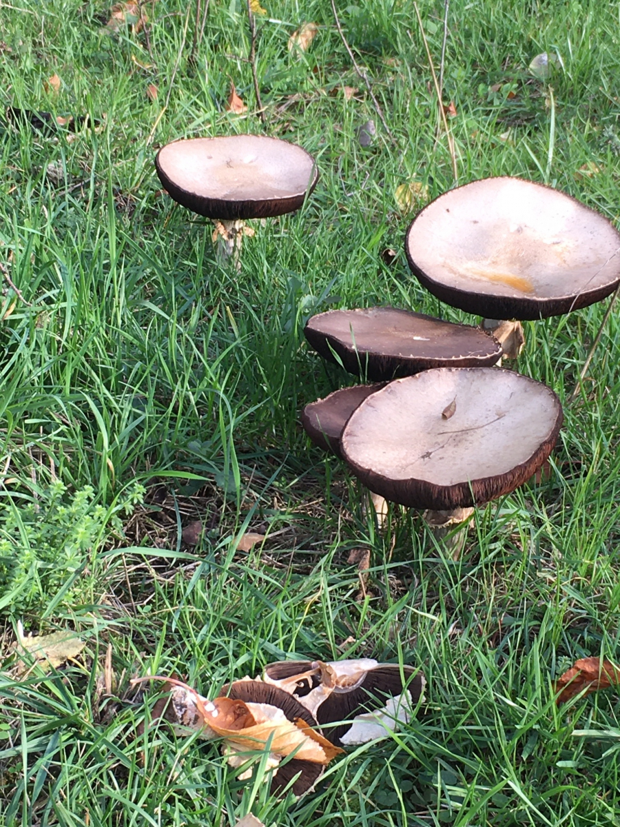 So große Pilze, die noch keiner zerstört hat, in Sicht der ersten Häuser des Dorfes direkt an einem Feldweg sieht man (leider) selten. In der Nähe gab es auch junge, knubbelige Exemplare, die noch halb im Boden steckten.