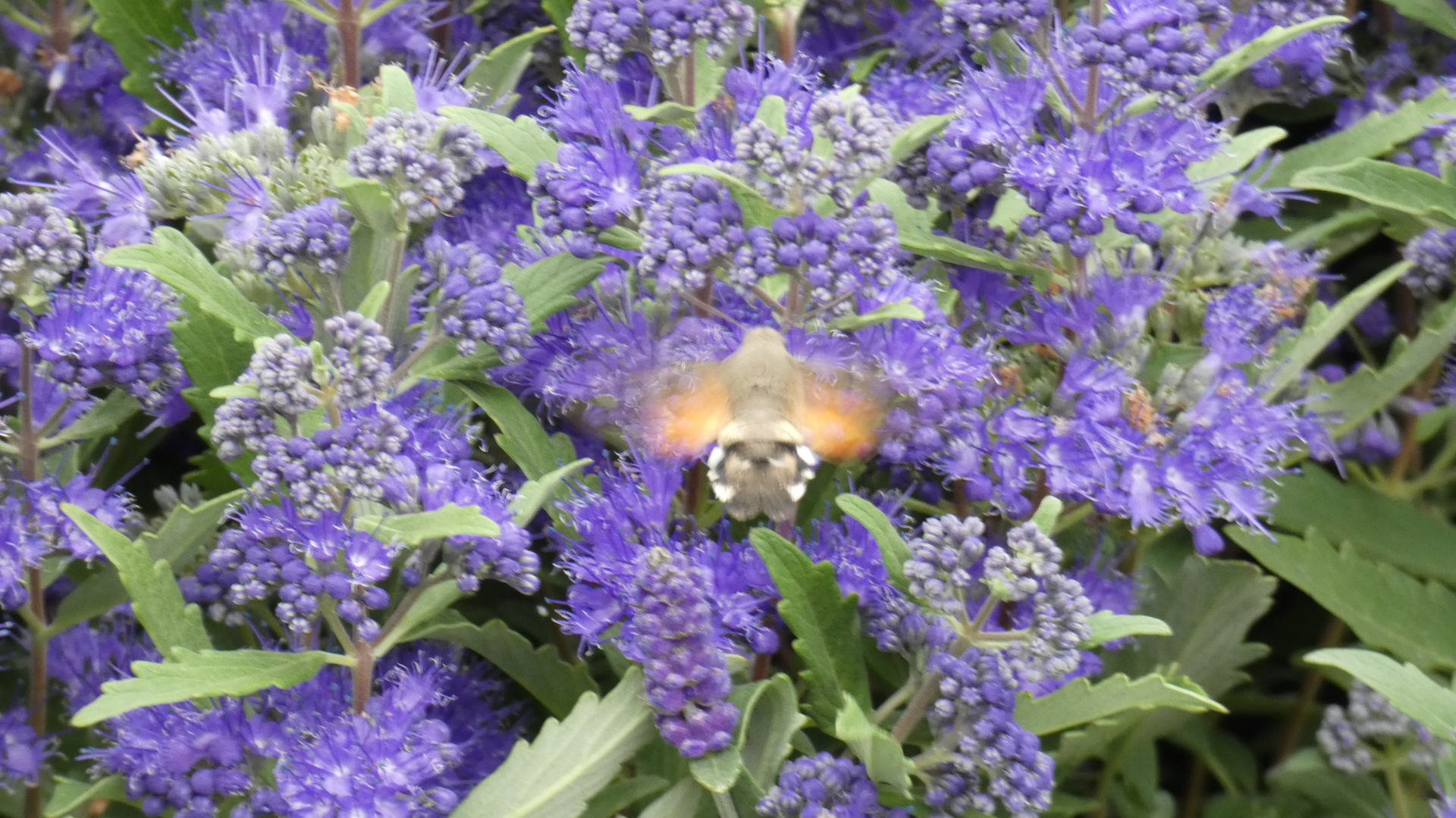 Hier ist ein Foto der Blüten einer Phacelia, das mein Mann neulich gemacht hat. Ein Taubenschwänzchen fliegt sie gerade an.