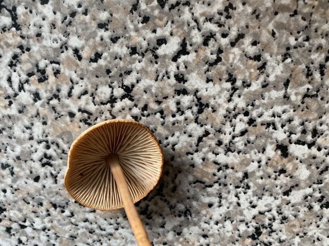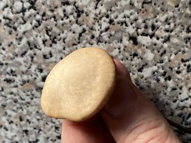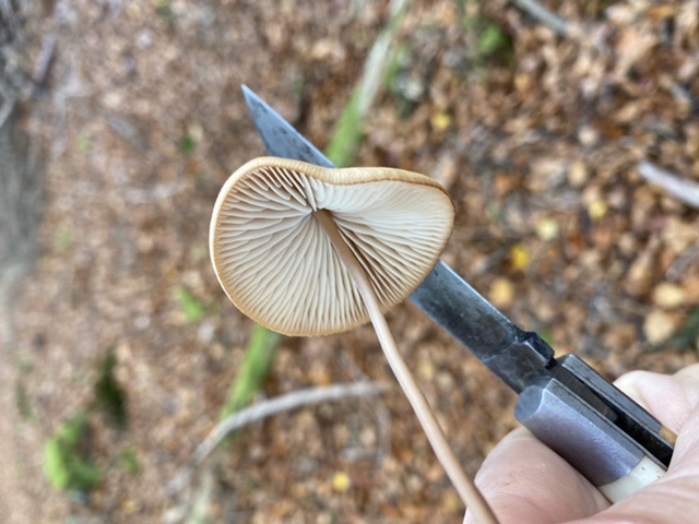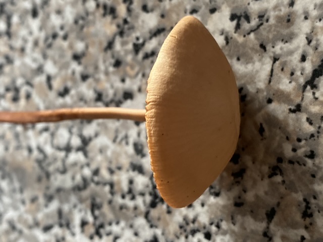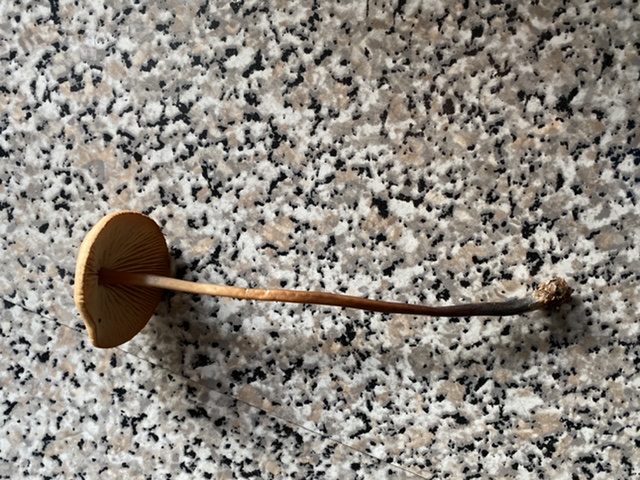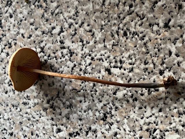 Der Echte Knoblauchschwindling hat nur ganz kurze Stielchen , nicht länger als Hutbreite.