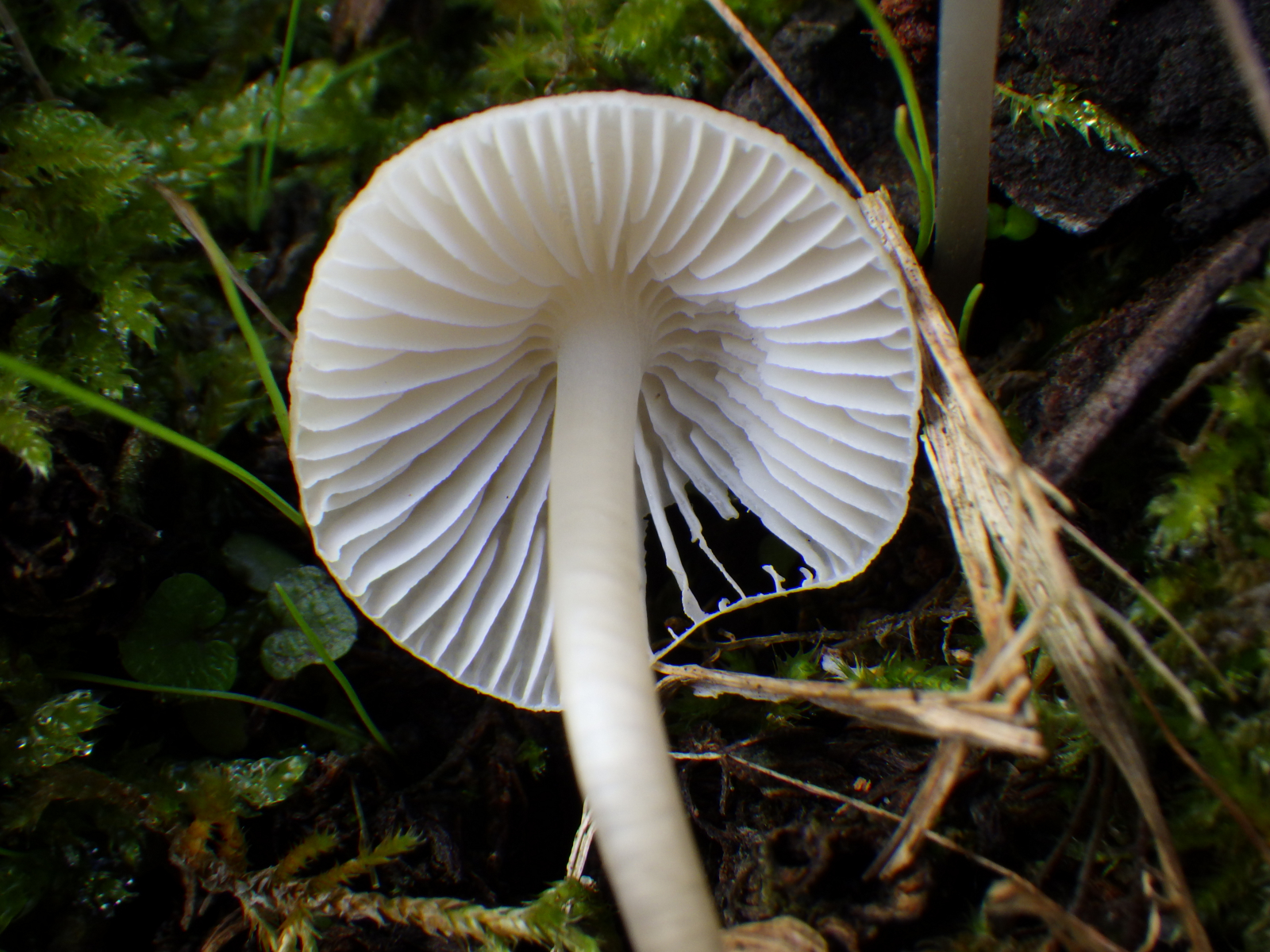 4) Sehr kleine Hemlinge auf vermoostem Kirschholztotholz, Hüte ø<1cm, Stiele um 1.5cm lang