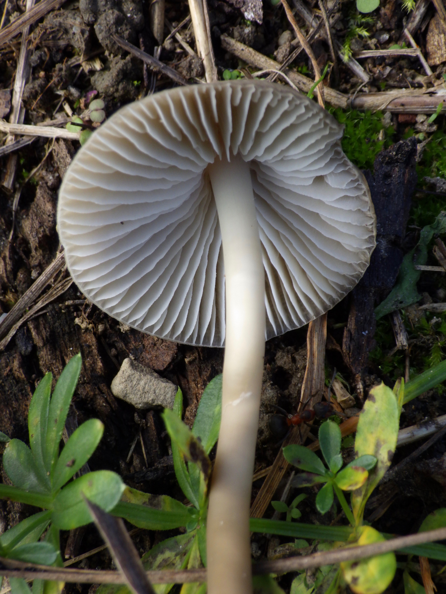 3) Hellbeige oder bräunliche Pilzchen auf Totholz mit langem verwurzeltem Stiel, Hüte teilweise gebuckelt, ein