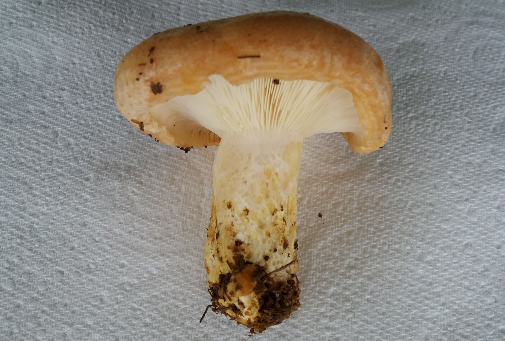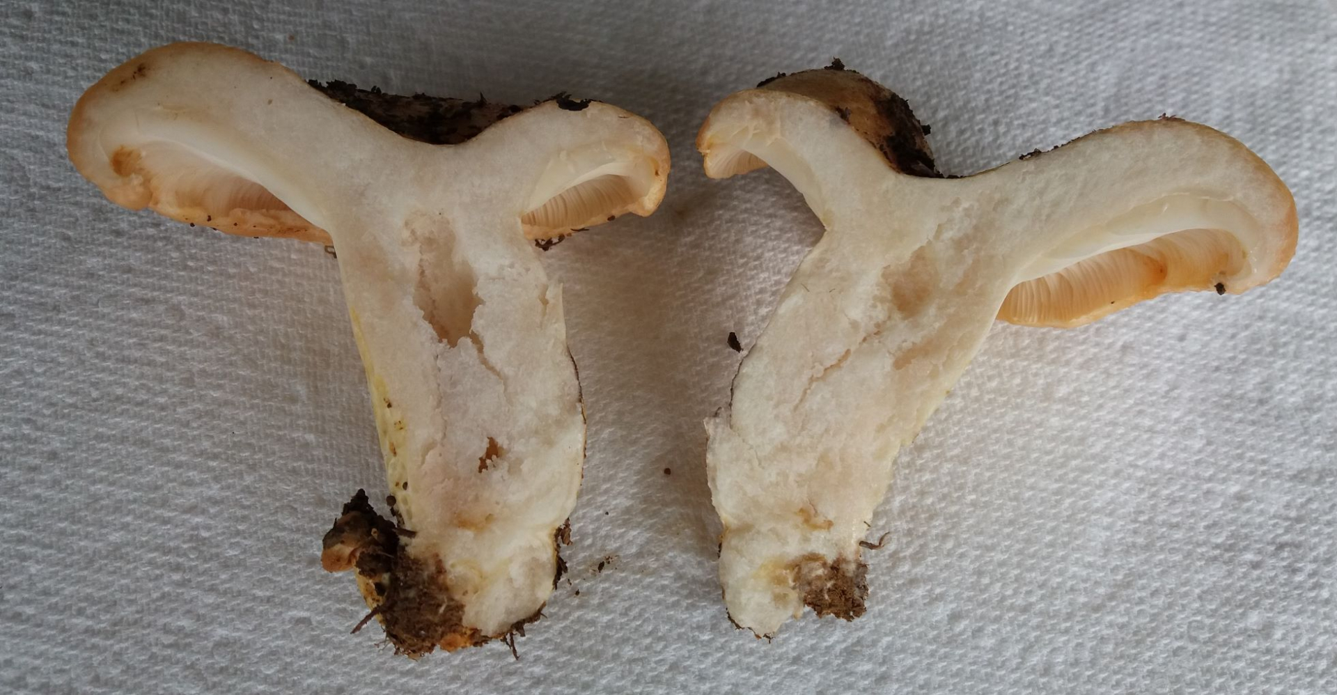 Exemplaren komplett hohl. Die umstehenden älteren Pilze erscheinen mir auch alle viel heller in der Hutfarbe.