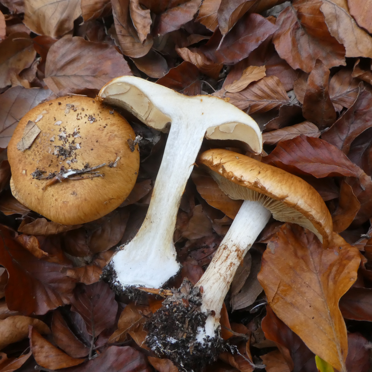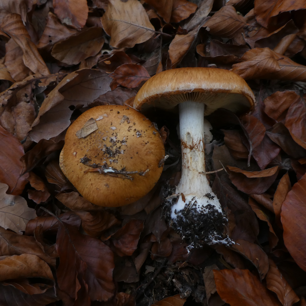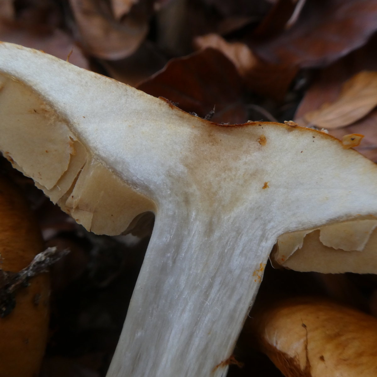 Funddaten: 27.10.2019, Altmühltal, ich glaube dort waren nur Buchen aber nachdem es an sich ein Mischwald ist, kann da auch ein verstreuter Nadelbaum gestanden haben. Hutduchmesser ca. 9 cm, Stielhöhe ca 8 cm, Huthaut abziehbar, Geruch nach Honig, Geschmack zunächst mild dann sehr leicht bitter. KOH-Reaktion siehe Fotos - ich habe keine Ahnung wie man diese Farbe interpretiert.