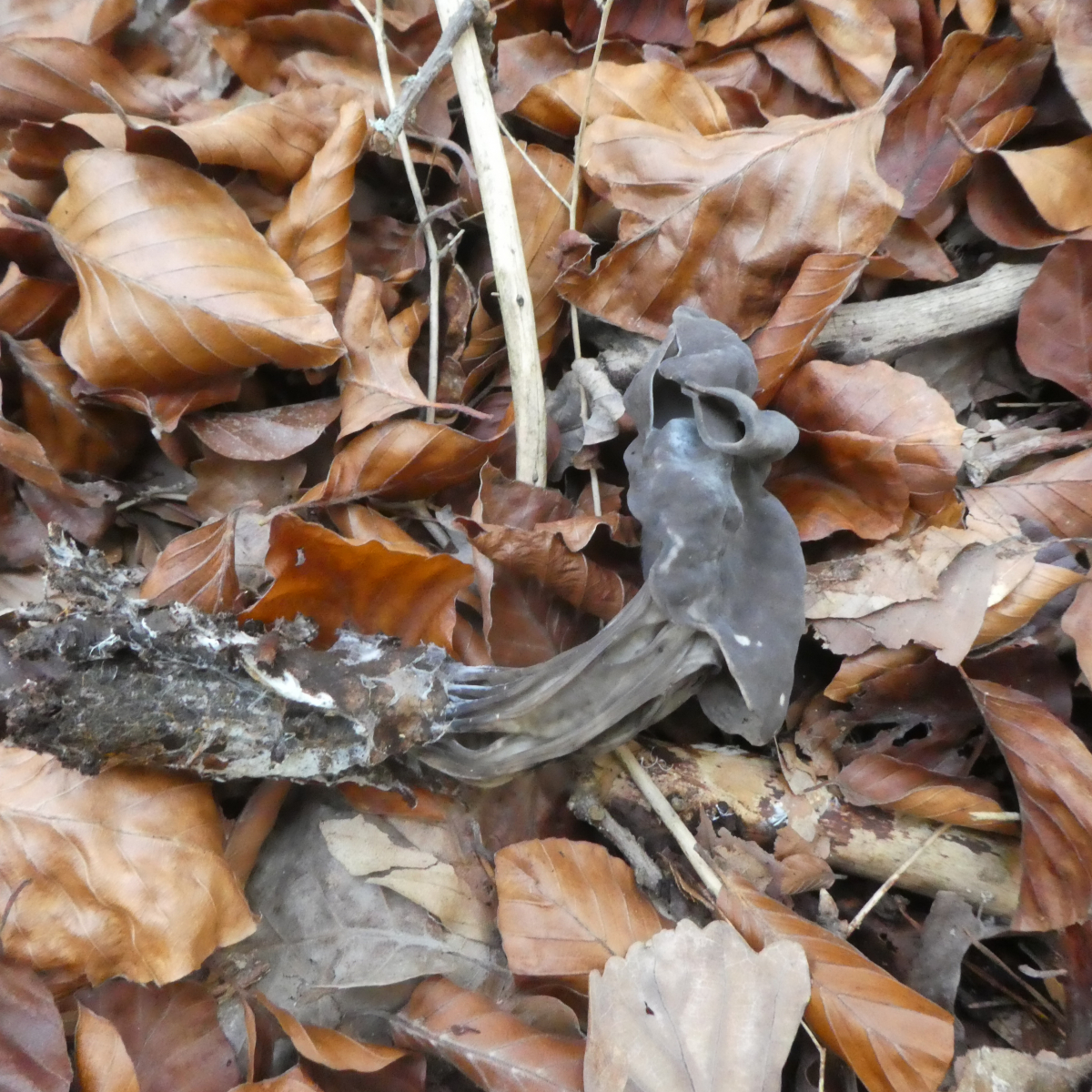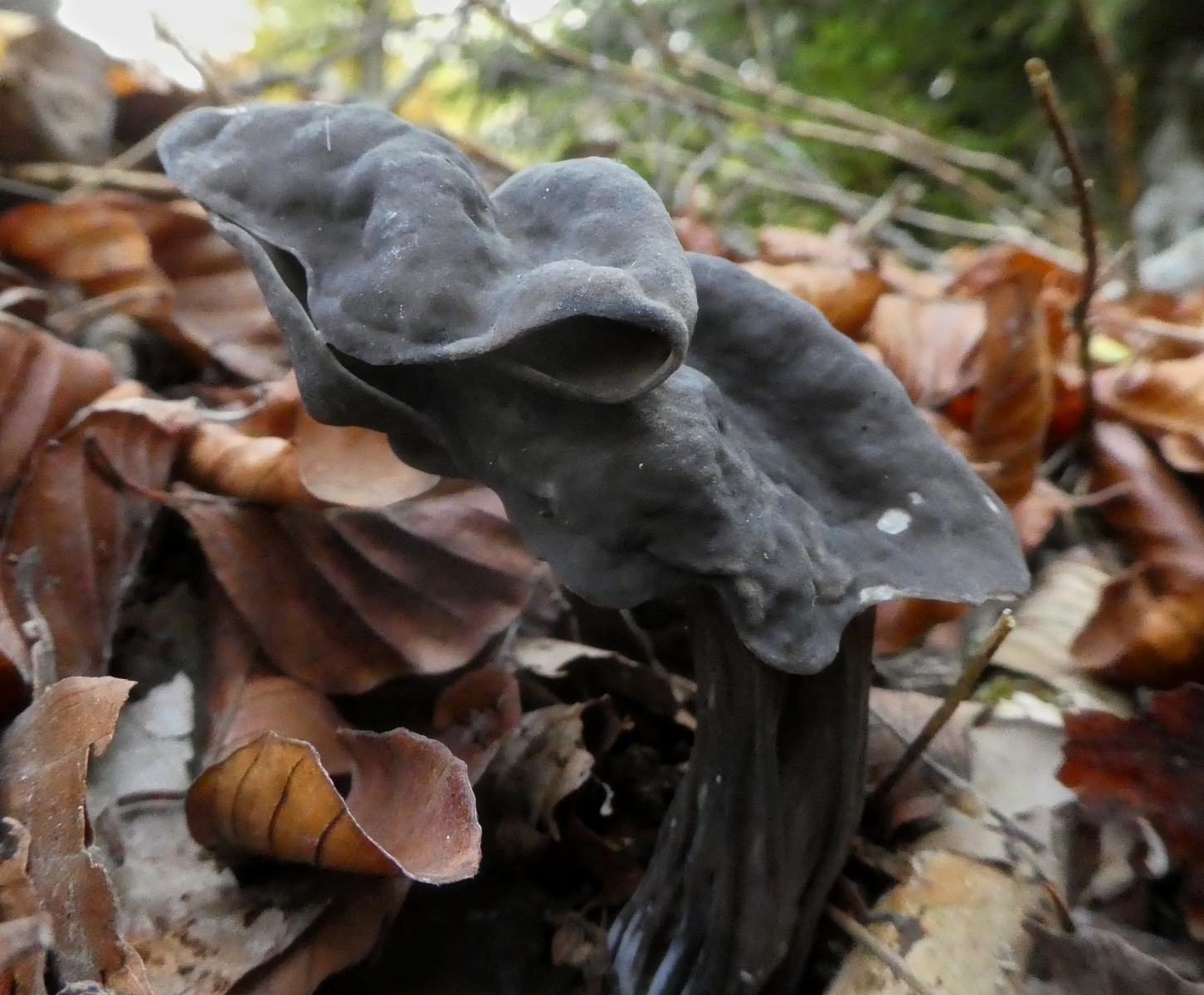 Zum Pilz: 27.10.2019, Altmühltal, Mischwald, überwiegend Rotbuchen, Höhe des Pilzes 11 - 12 cm. Die Fotos sind falsch belichtet - der Pilz ist einen Takt dunkler, eher schwarz-braun, eher so wie auf dem ersten Foto.