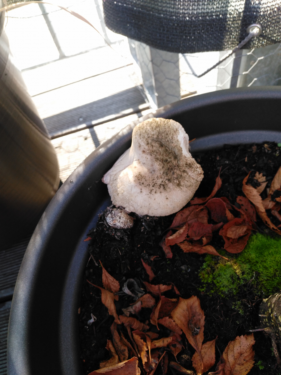 Könnte vielleicht ein Leucoagaricus sein. Nachdem die kürzlich allgegenwärtig waren, besteht durchaus die Möglichkeit, dass der sich mal in einen Blumentopf verirrt.
