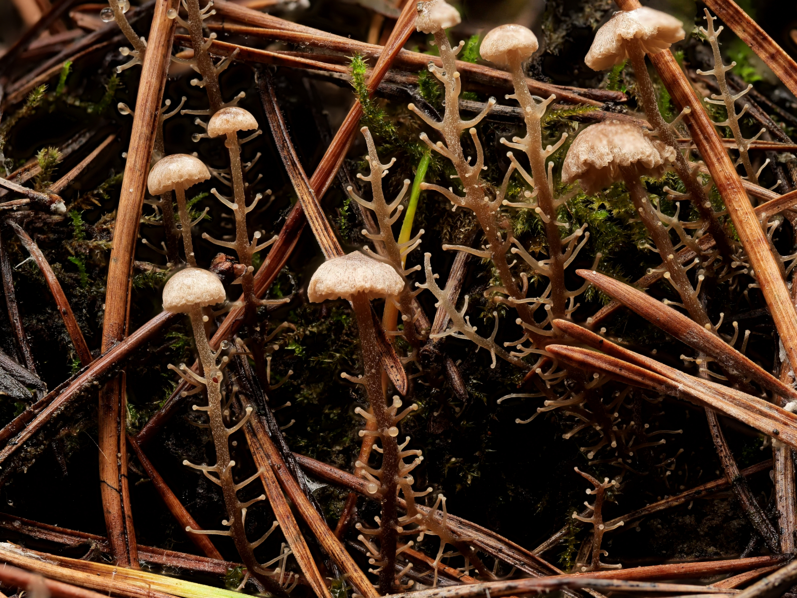 DerTraubenstielige Sklerotienrübling Dendrocollybia racemosa hatte den Wetterumschwung gut überstanden.