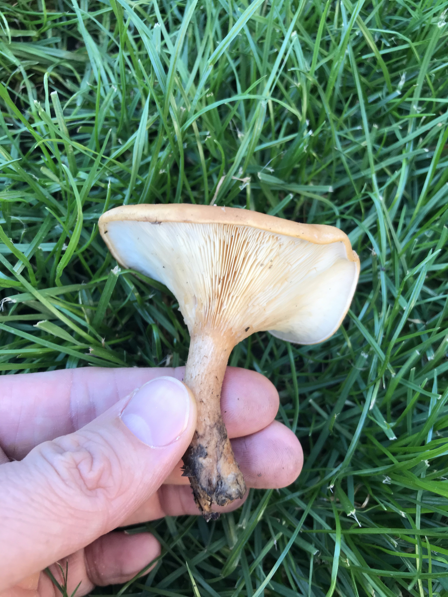 Die Nummer eins riecht nur schwach, aber nicht nach Marzipan. Die Lamellen setzen nicht am Stiel an (kleiner Graben)