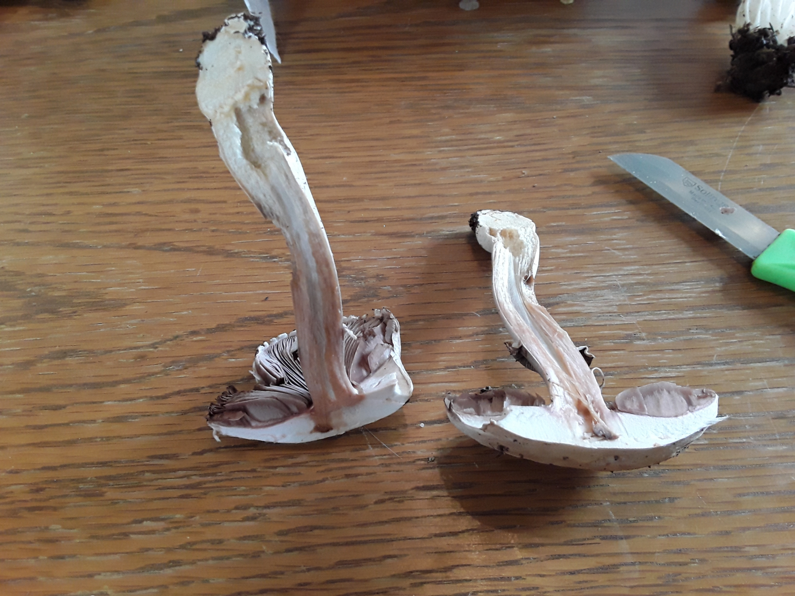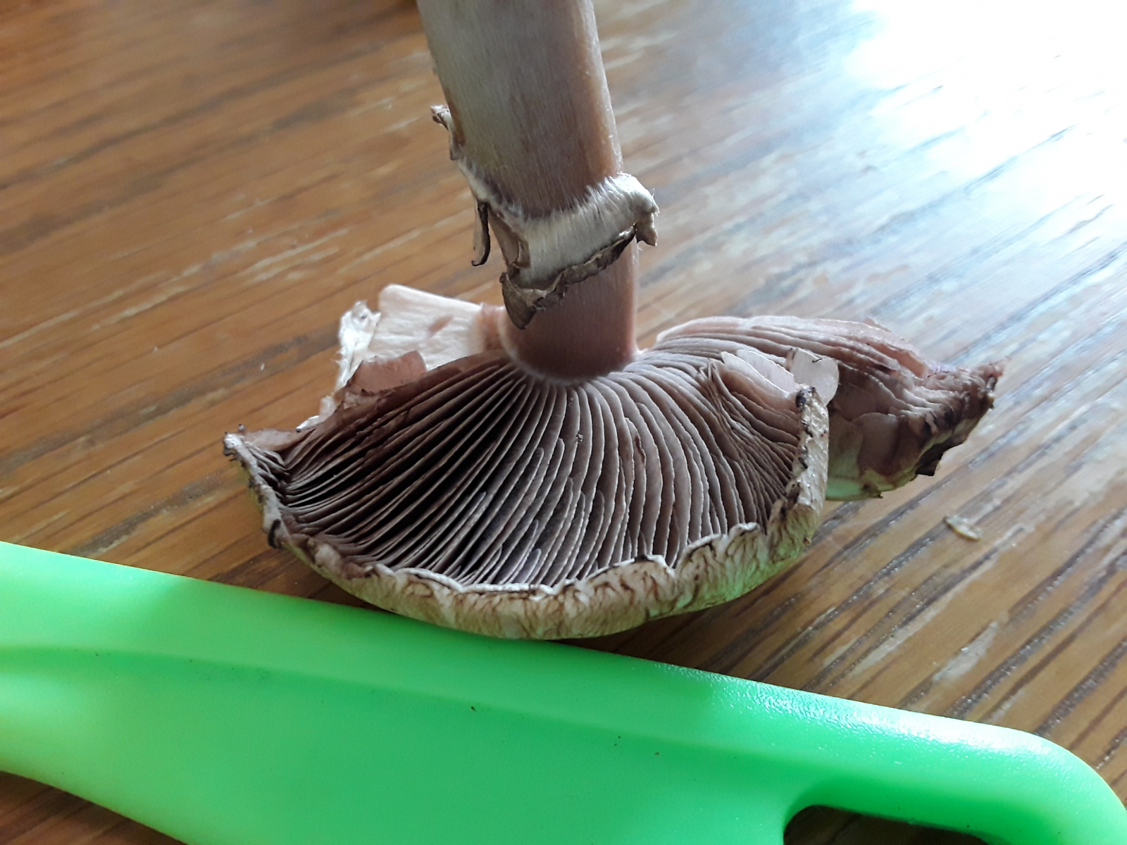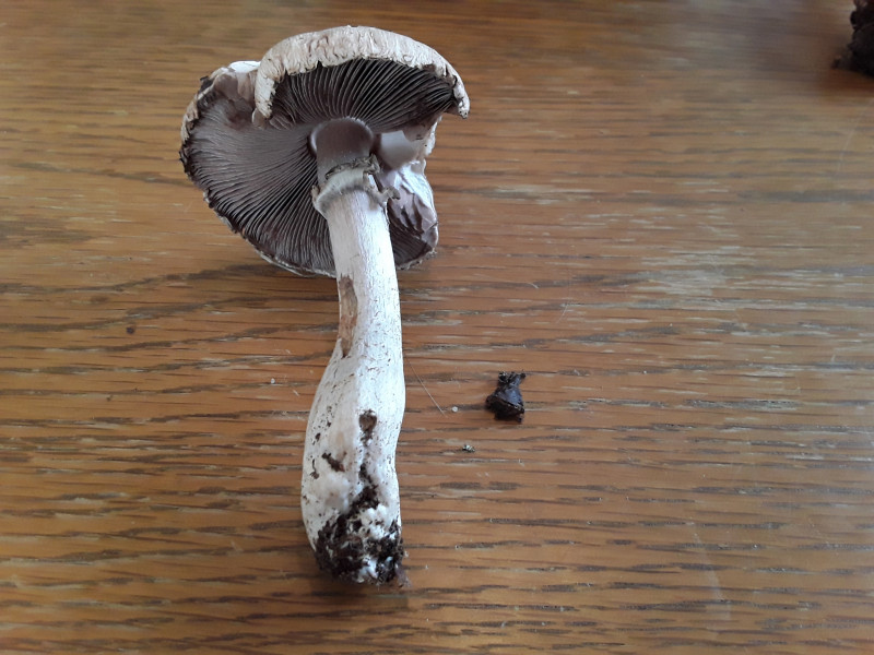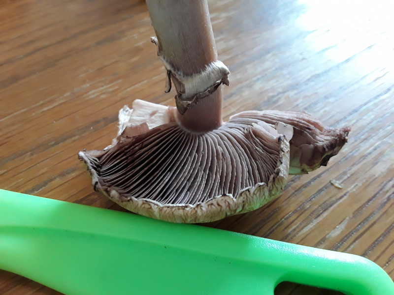 Den Champignon hab ich in einer Kiefernmonokultur gefunden, Geruch pilzig mit einer leichten Nussnote, die Lamellen sind leicht brüchig.