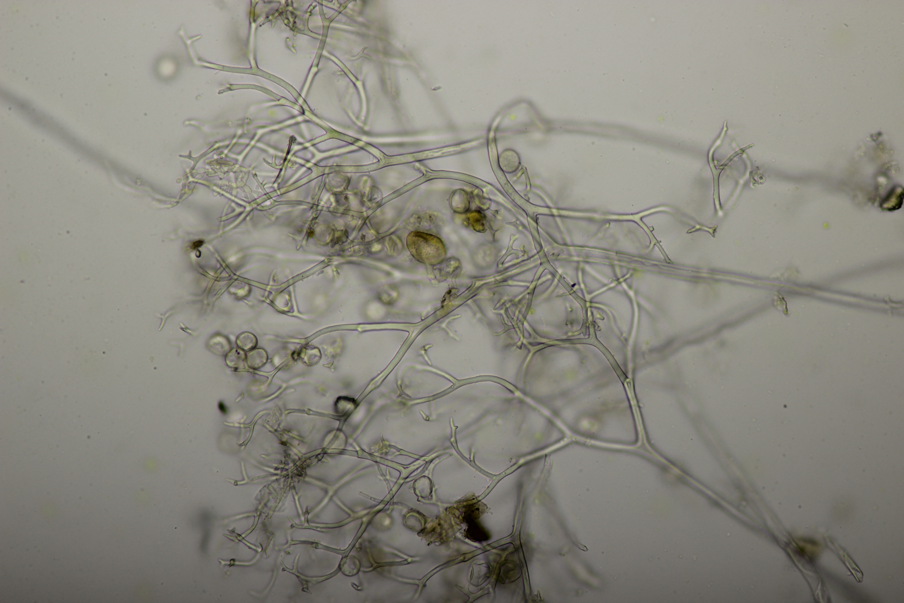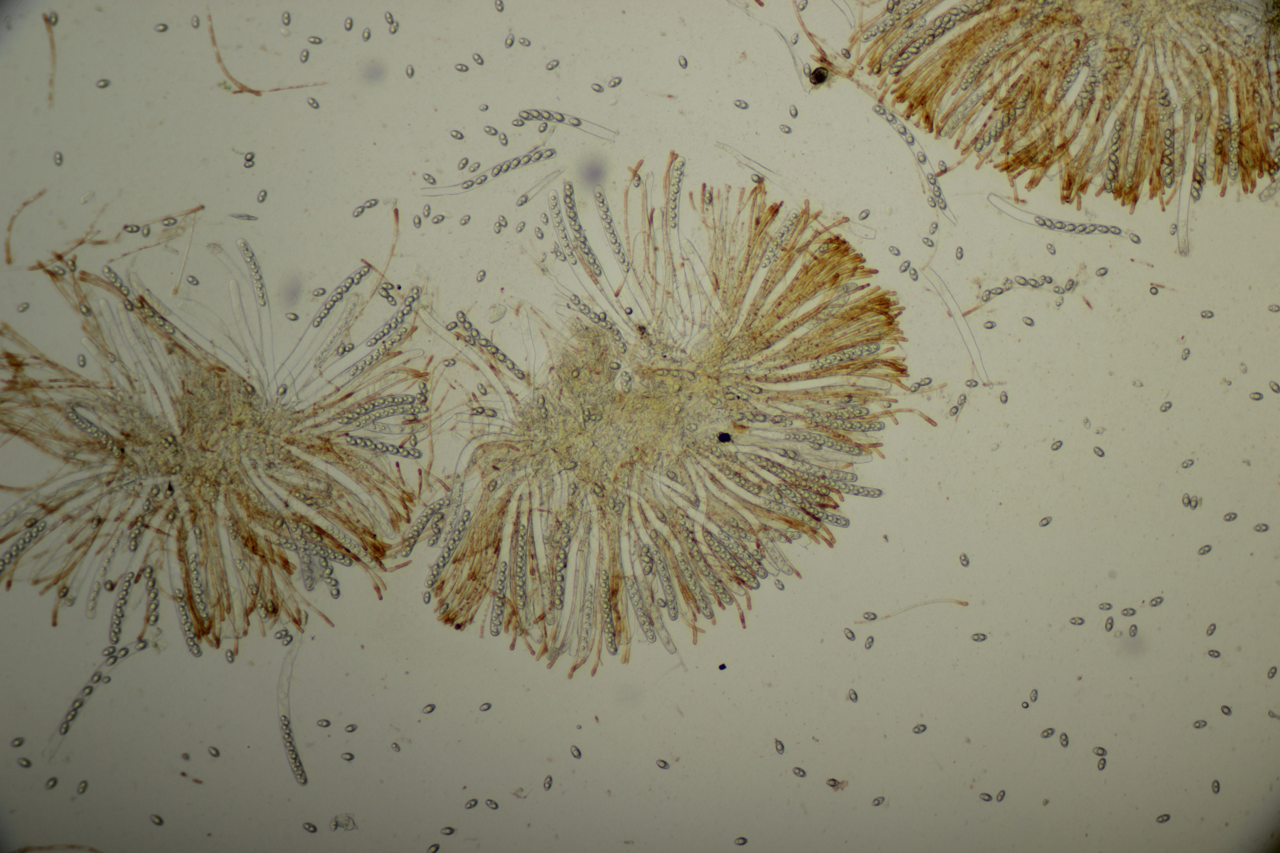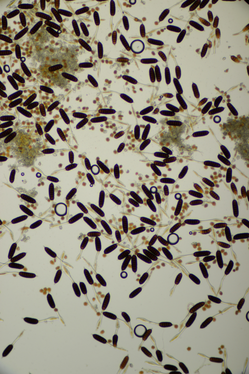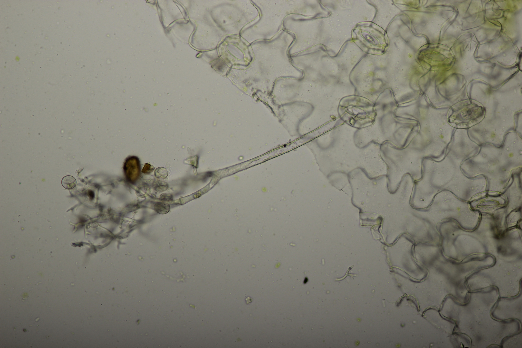 Hier sieht man sehr schön, wie die Konidienträger aus den Spaltöffnungen wachsen