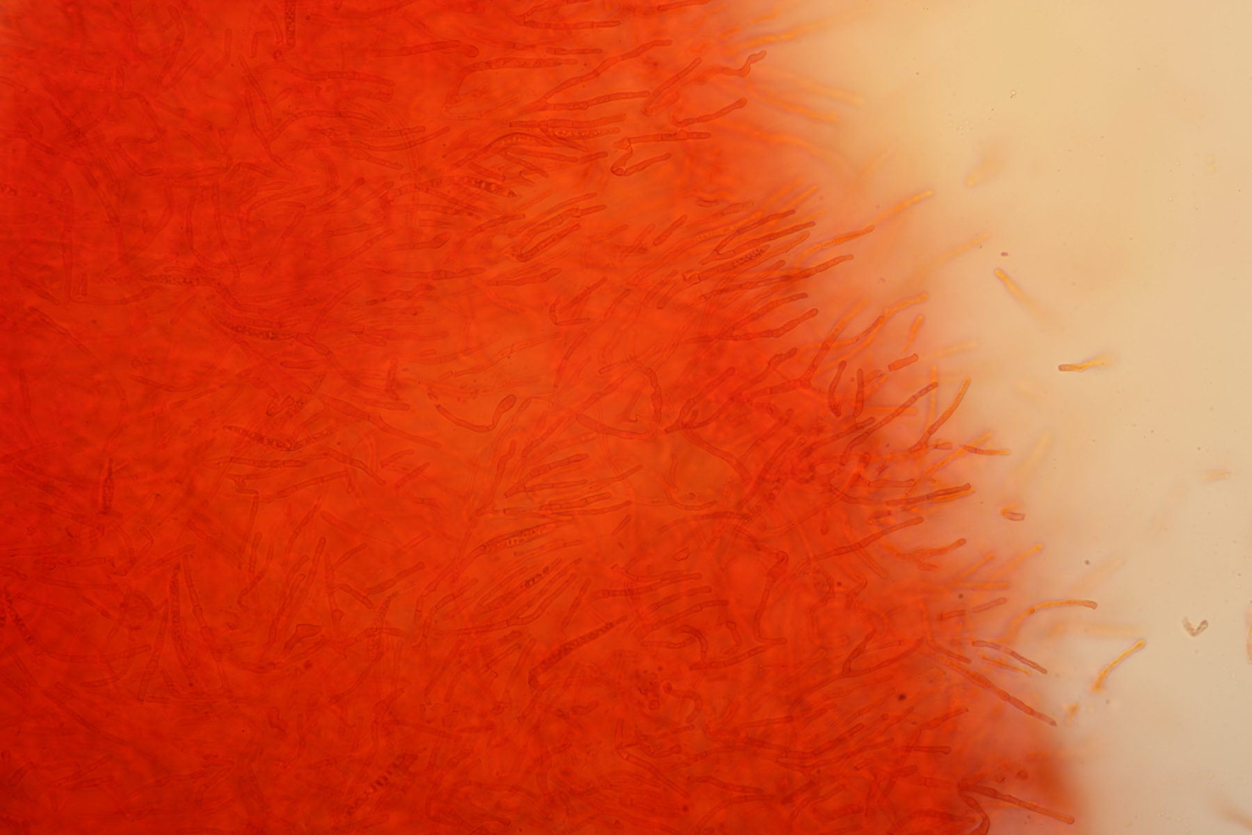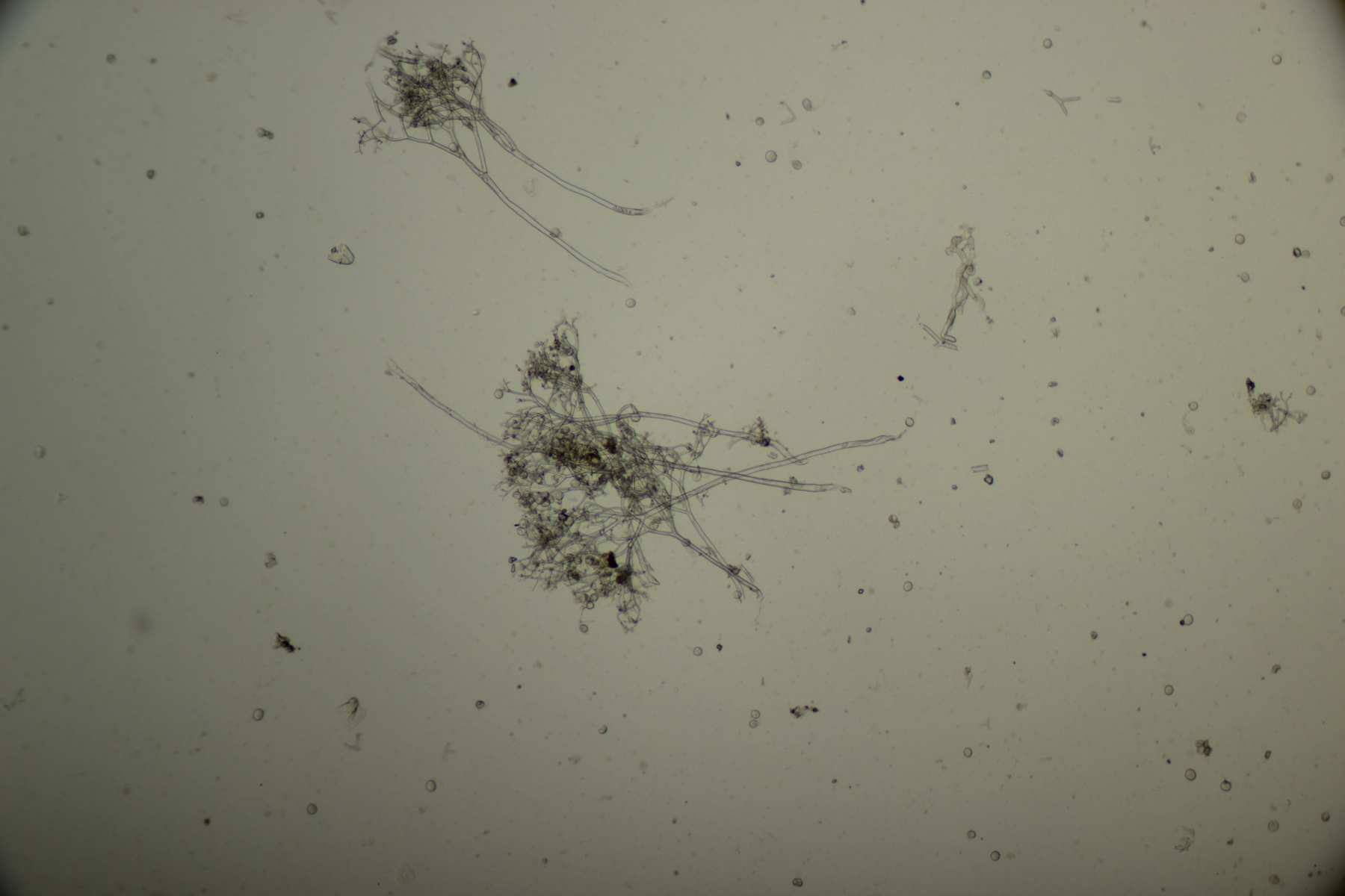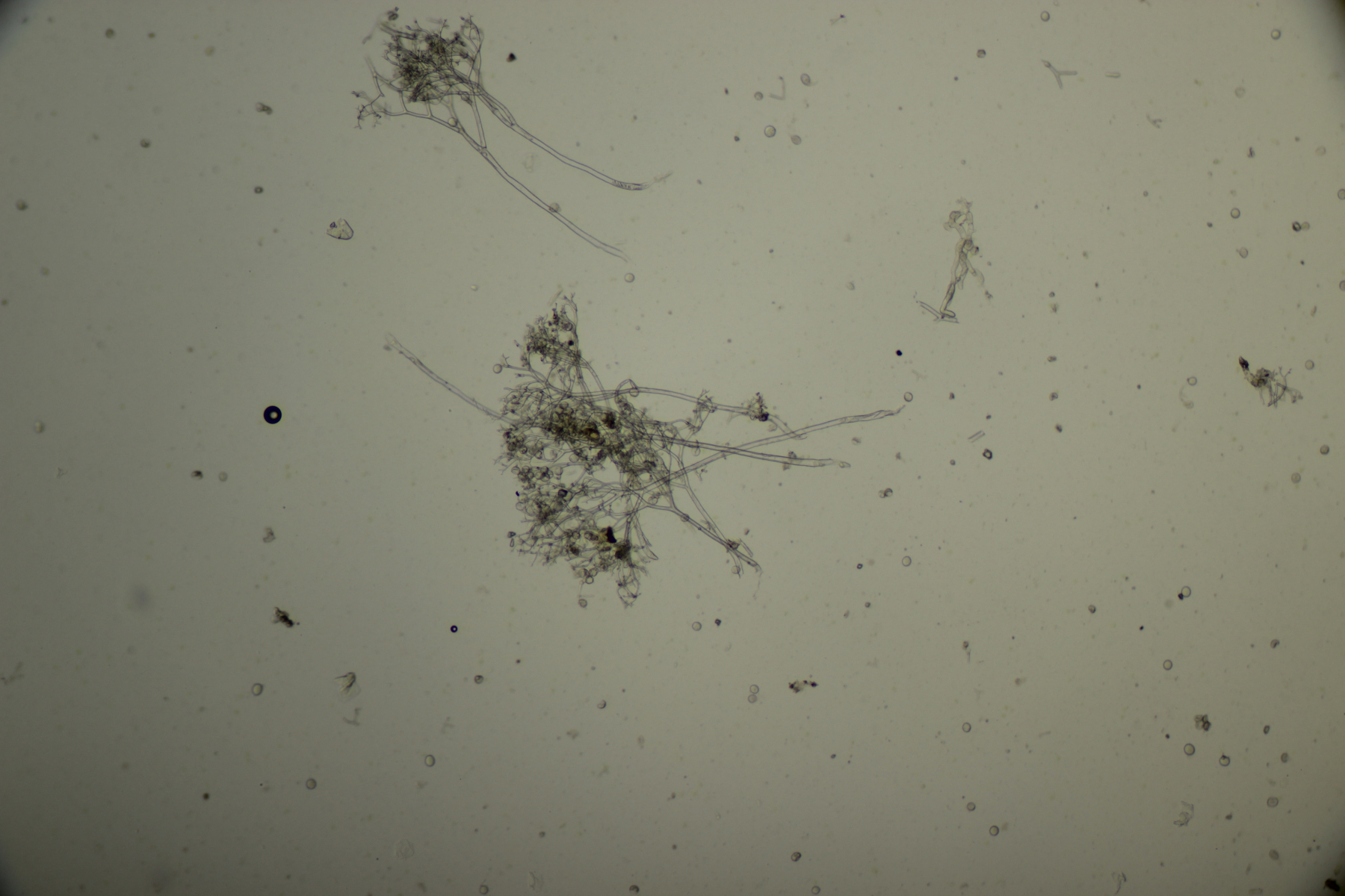 Hier sieht man sehr schön, wie die Konidienträger aus den Spaltöffnungen wachsen