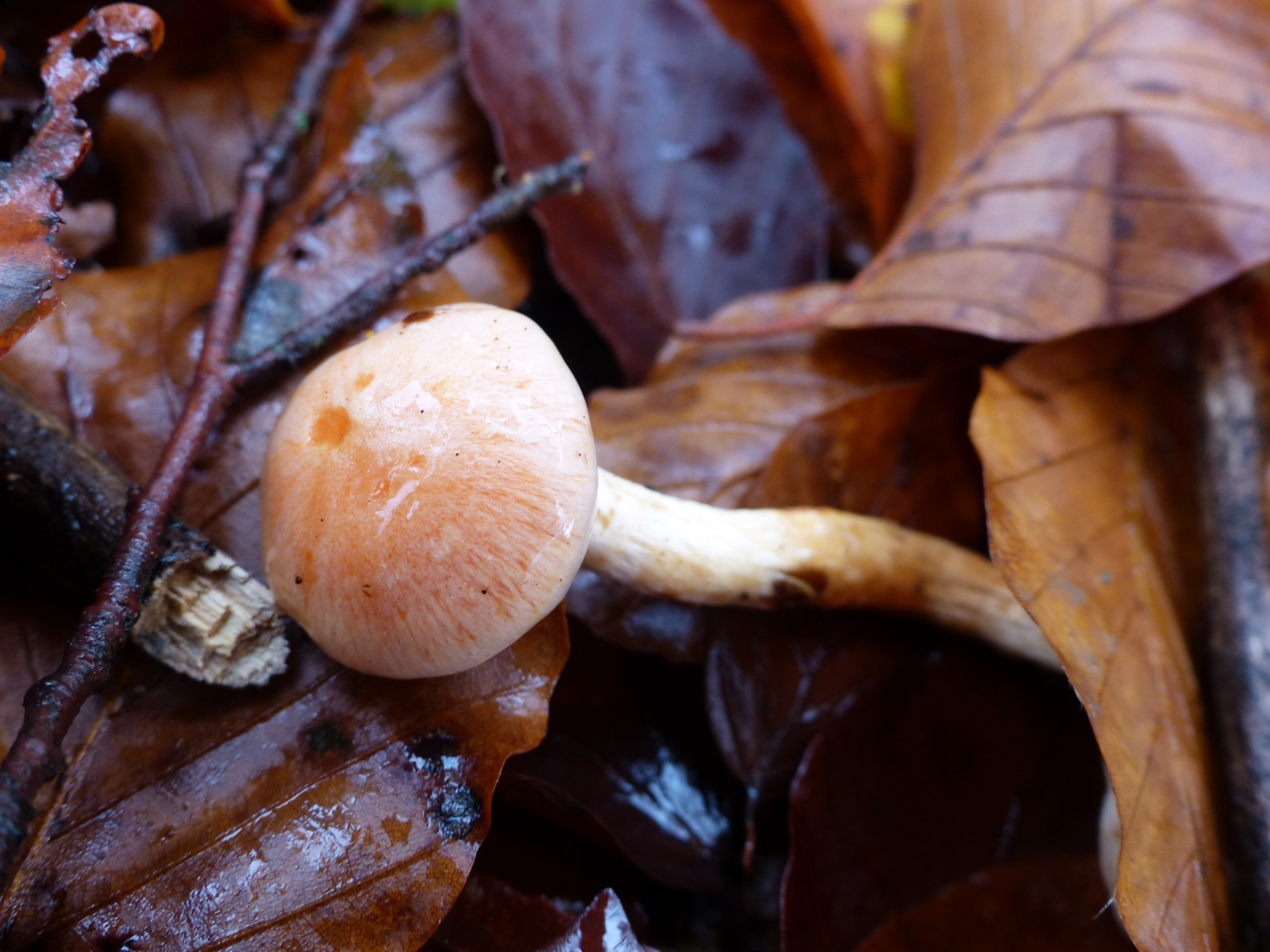 Hut: ca. 2-4 cm Durchmesser, orange, hutmittig einen orangen Punkt, ein wenig schleimig,