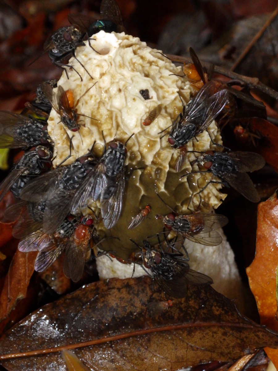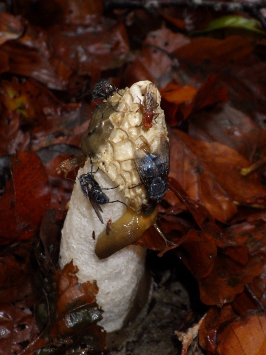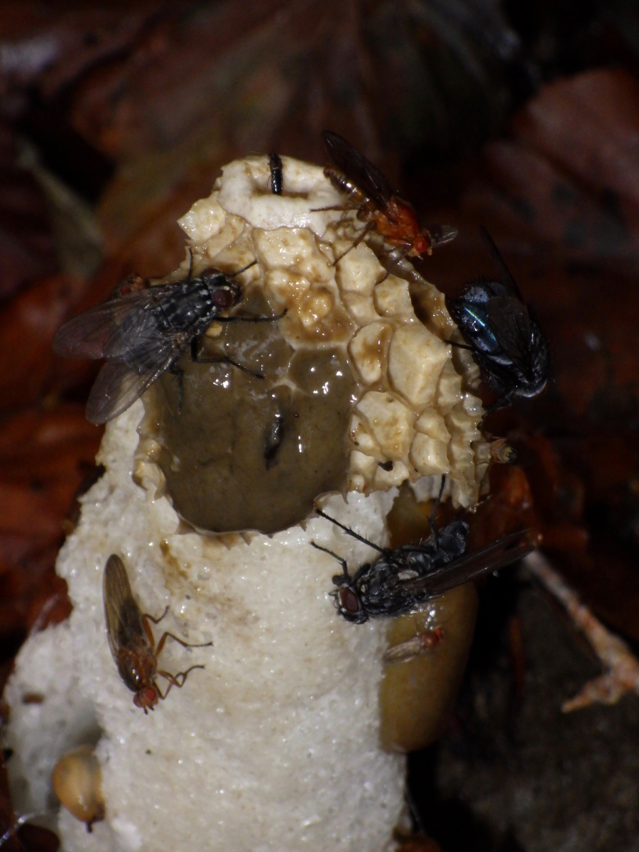 Bei den älteren Pilzen verflüssigt sich die Sporenmasse und wird etwas heller, übler Aasgeruch tritt auf, zunehmend finden sich Insekten ein zum Fressen!
