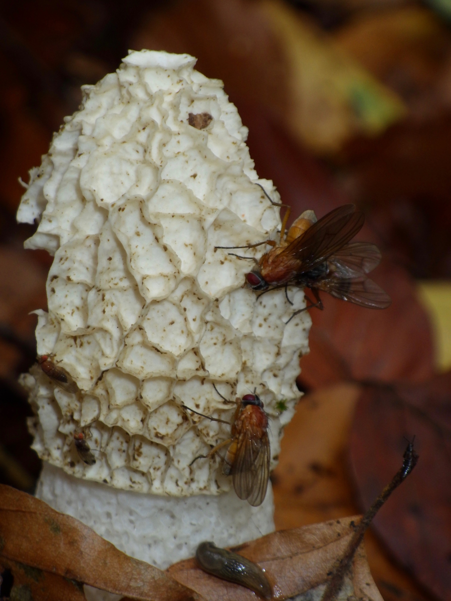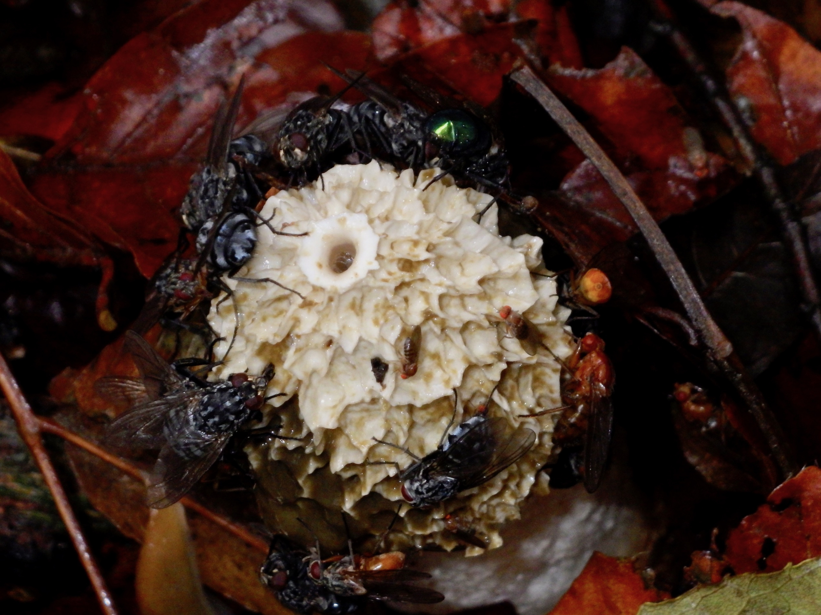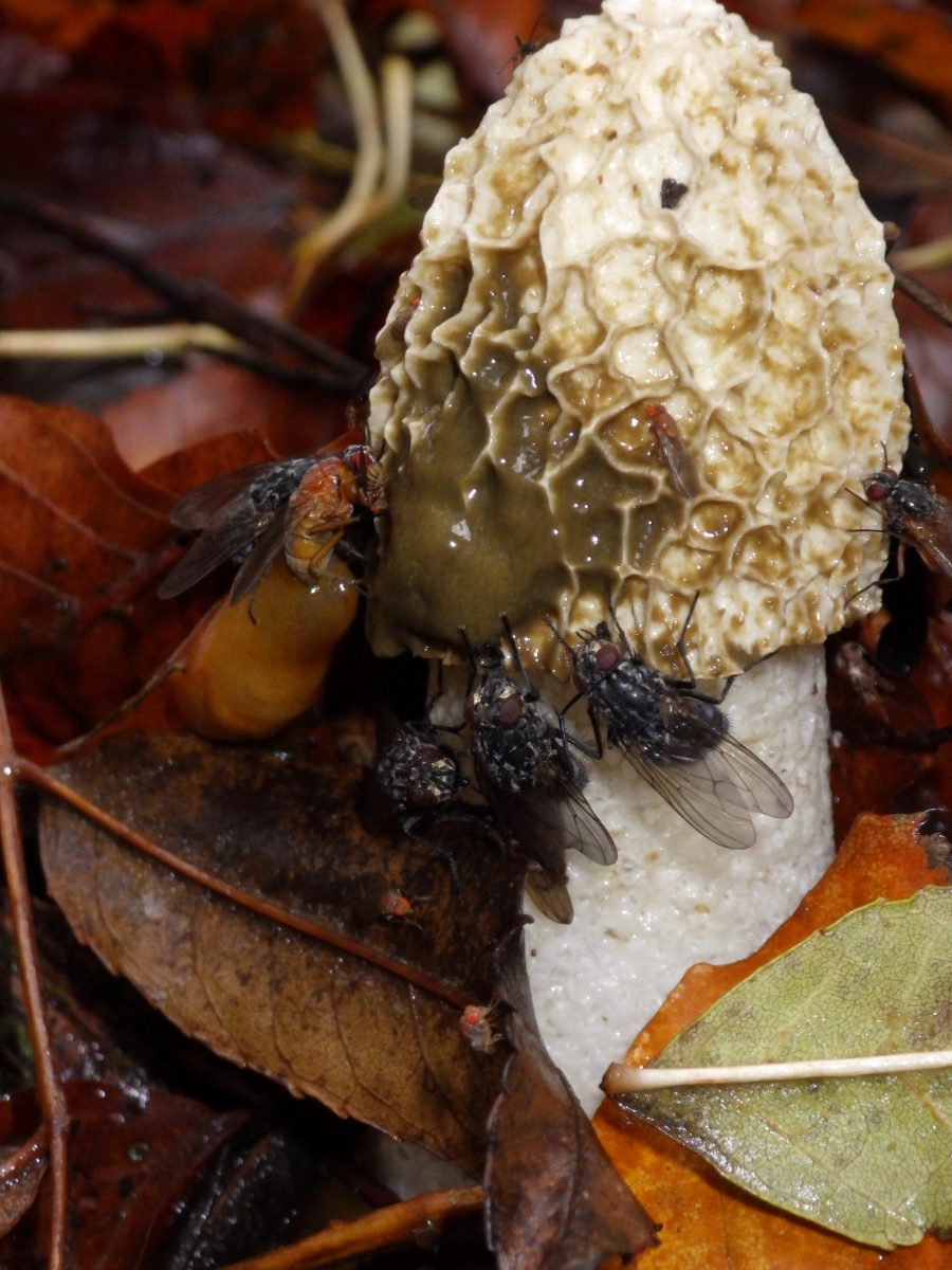 Bei den älteren Pilzen verflüssigt sich die Sporenmasse und wird etwas heller, übler Aasgeruch tritt auf, zunehmend finden sich Insekten ein zum Fressen!