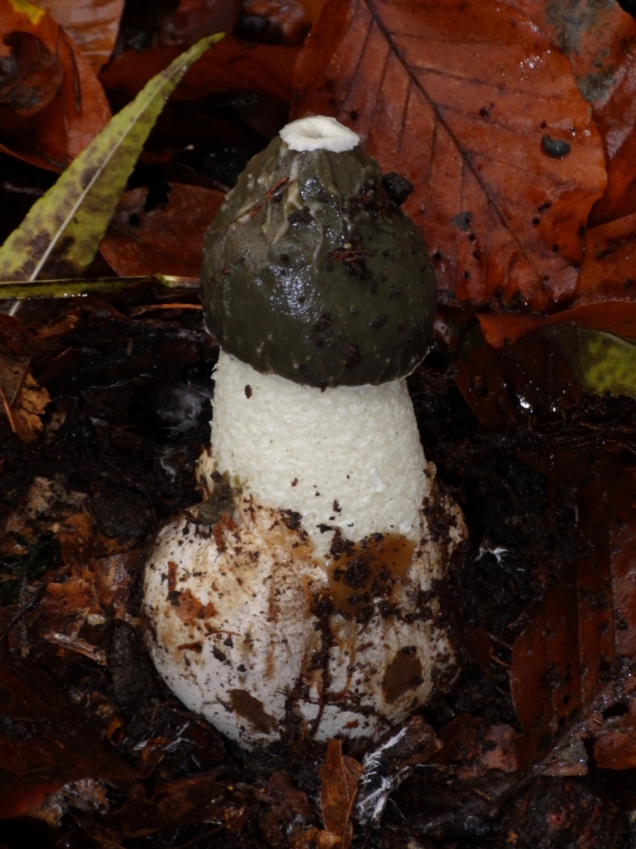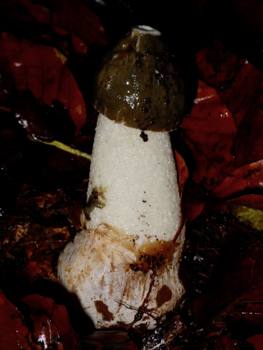 5 Stunden später ist der gleiche Pilz ≈3cm gewachsen, die gallertige Sporenmasse ist dunkelbraungrün, noch kein übler Geruch, noch keine Insekten
