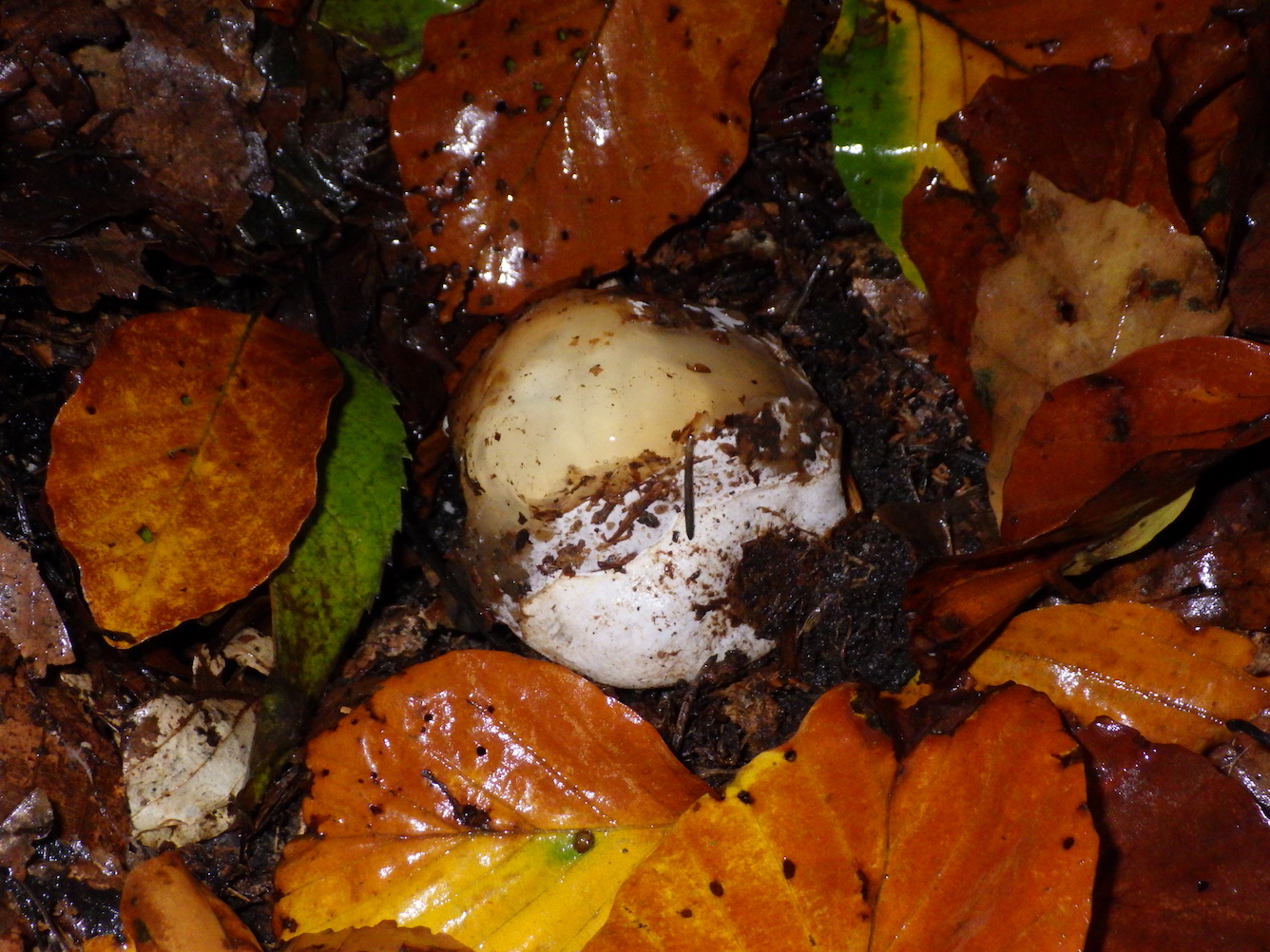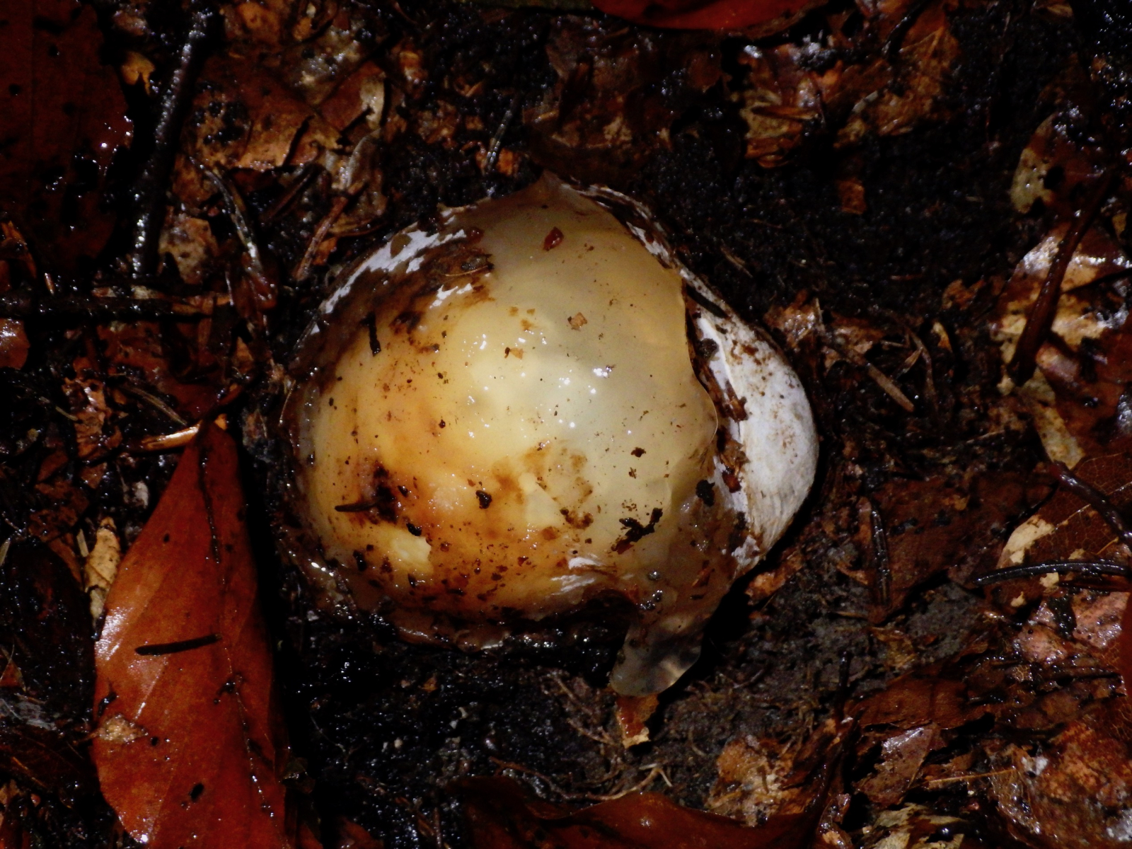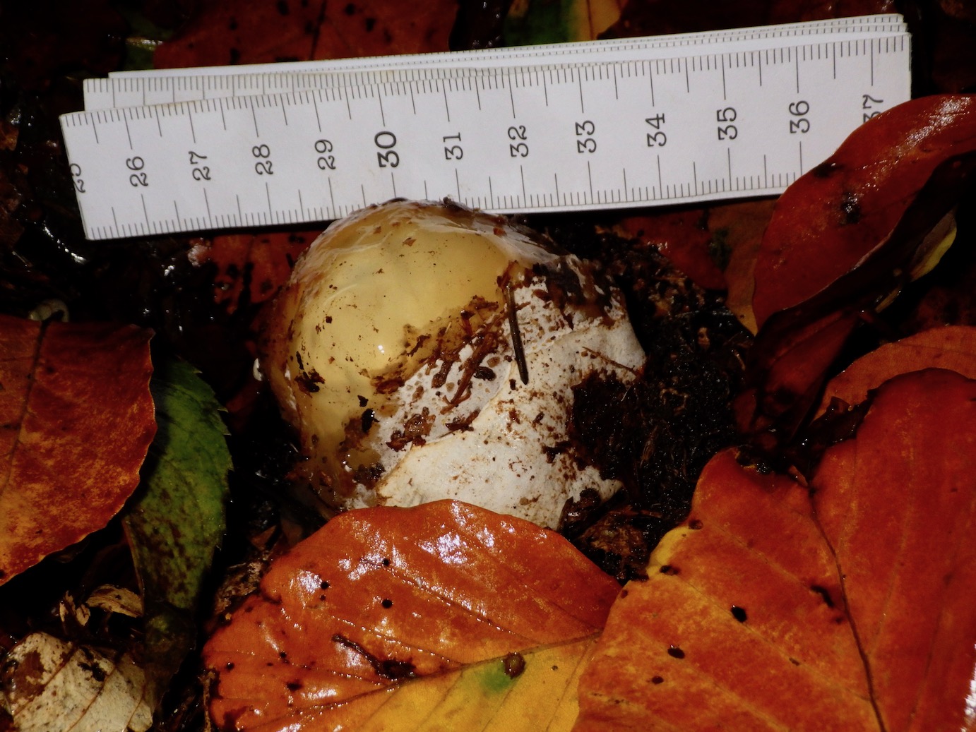 Hexenei: ≈ 6cm ø, oberhalb bedeckende gallertige gelbe Masse, unten weicher weisslichen Knollen