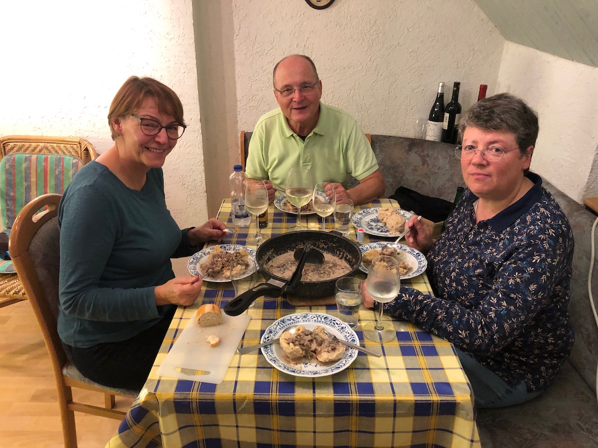 Pilztechnisch wurden auch die Abende bestmöglich genutzt. Mit drei anderen Mitgliedern des Kurses war ich im Jahr zuvor bei Andreas zum Mikroskopierkurs. Wir hatten Zimmer in einer Pension gebucht und abends Pilze verkostet. Hier exemplarisch die Menükarte und ein Blick hinter die Verkostungs-Kulissen. Es gab selbstverständlich auch jeweils eine vegetarische Variante. Am Ende bewerteten wir unsere Verkostung. Das Ergebnis werde ich gelegentlich in die küchenmykologischen Liste eintragen.