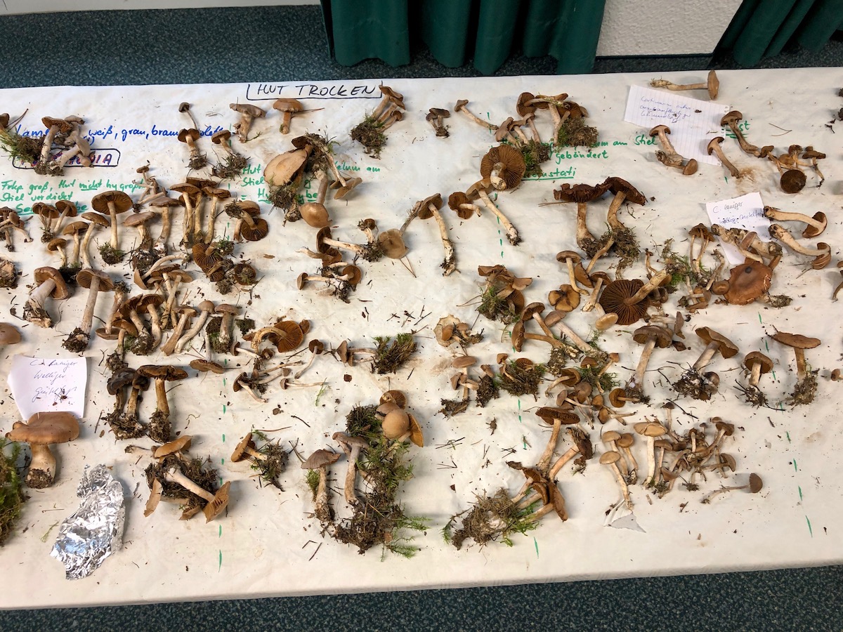 Es kam auch etliches an Cortinarien zusammen. Wer schon einmal Pilzkurse besucht hat, wird feststellen, das die Systematik der Verteilung auf dem Tisch eine Andere ist als sonst. Eigentlich logisch, da Schleierling Braunsporer sind. Allerdings gab es einen Tisch für sonstige Funde und der war erfreulicherweise auch immer mit interessanten Pilzen bestückt.