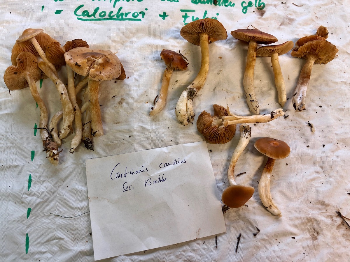 Es kam auch etliches an Cortinarien zusammen. Wer schon einmal Pilzkurse besucht hat, wird feststellen, das die Systematik der Verteilung auf dem Tisch eine Andere ist als sonst. Eigentlich logisch, da Schleierling Braunsporer sind. Allerdings gab es einen Tisch für sonstige Funde und der war erfreulicherweise auch immer mit interessanten Pilzen bestückt.