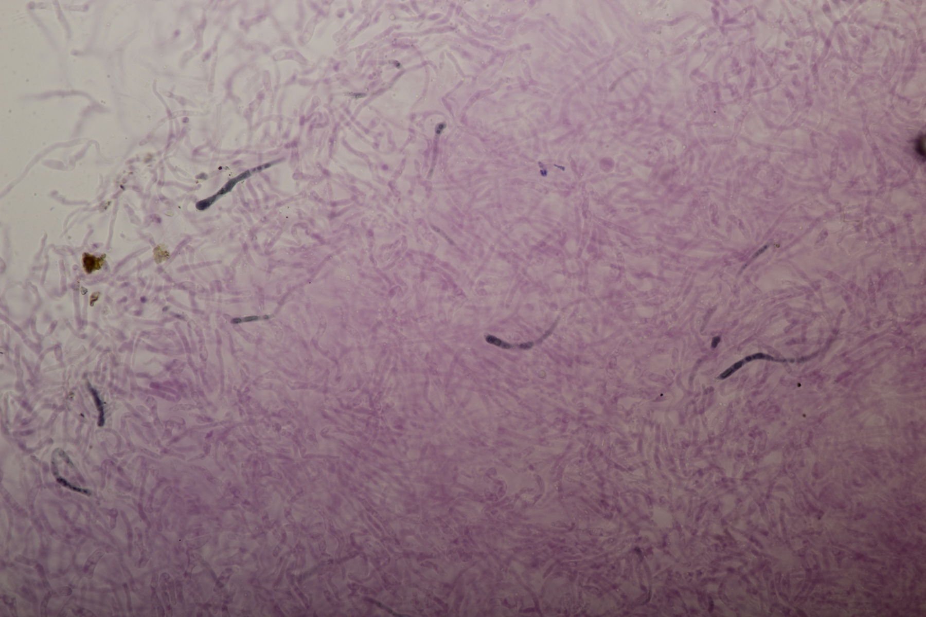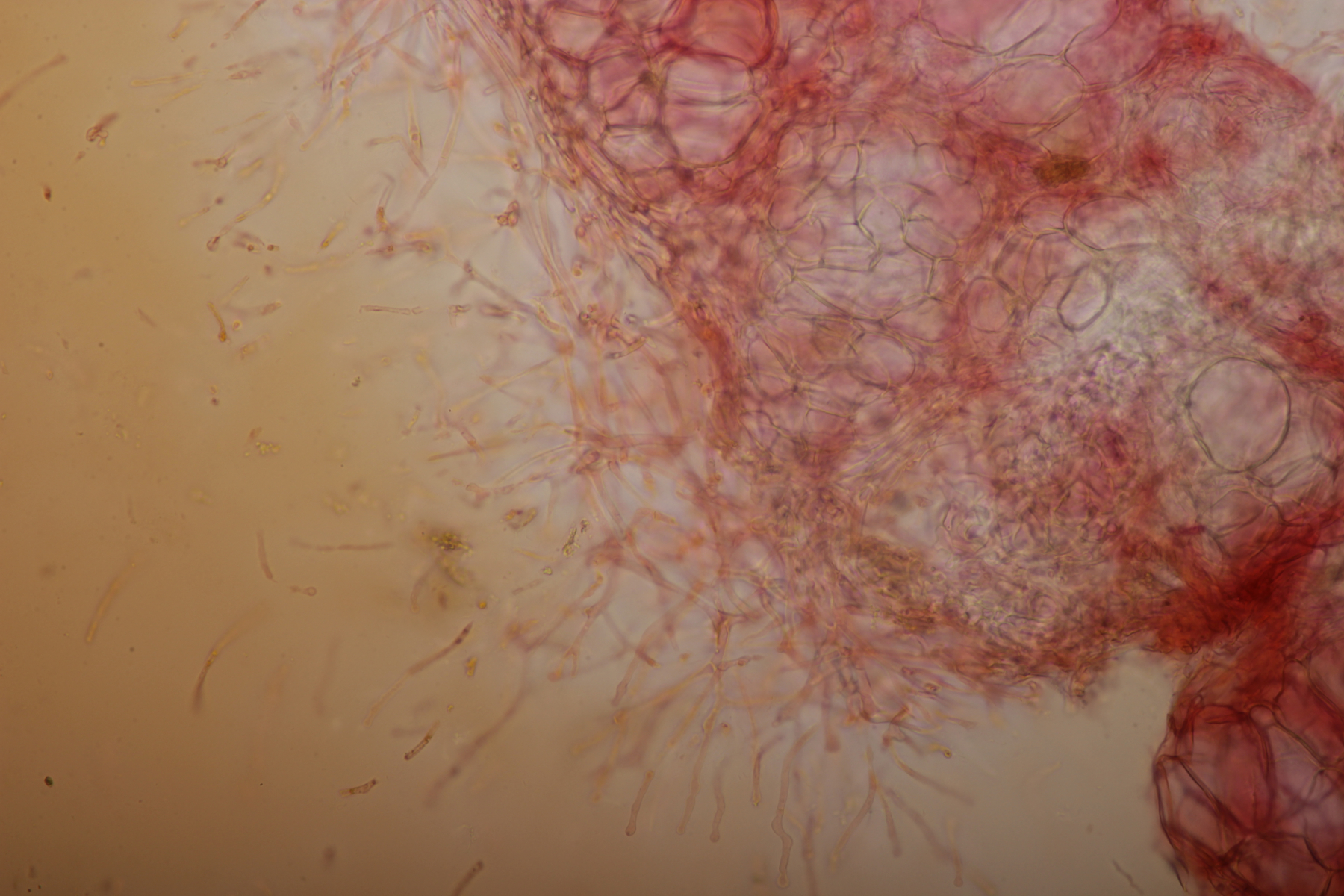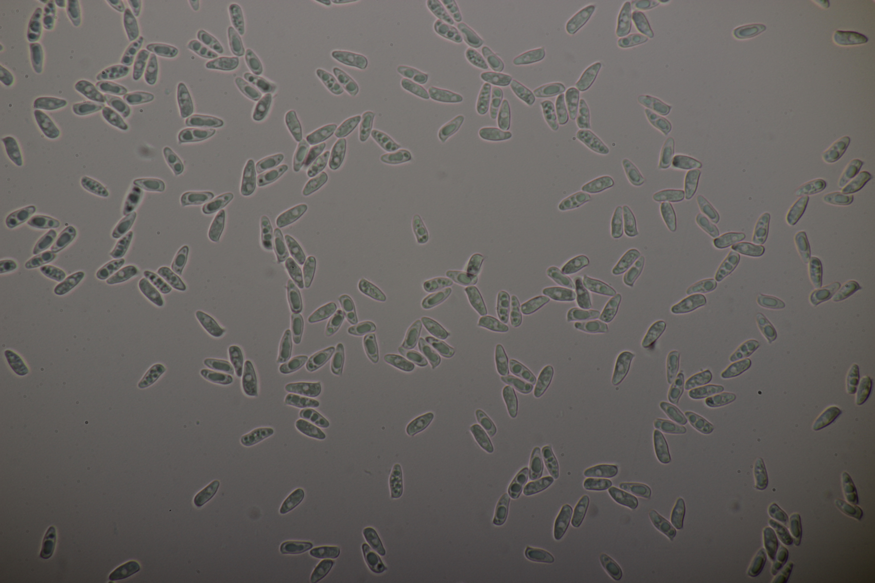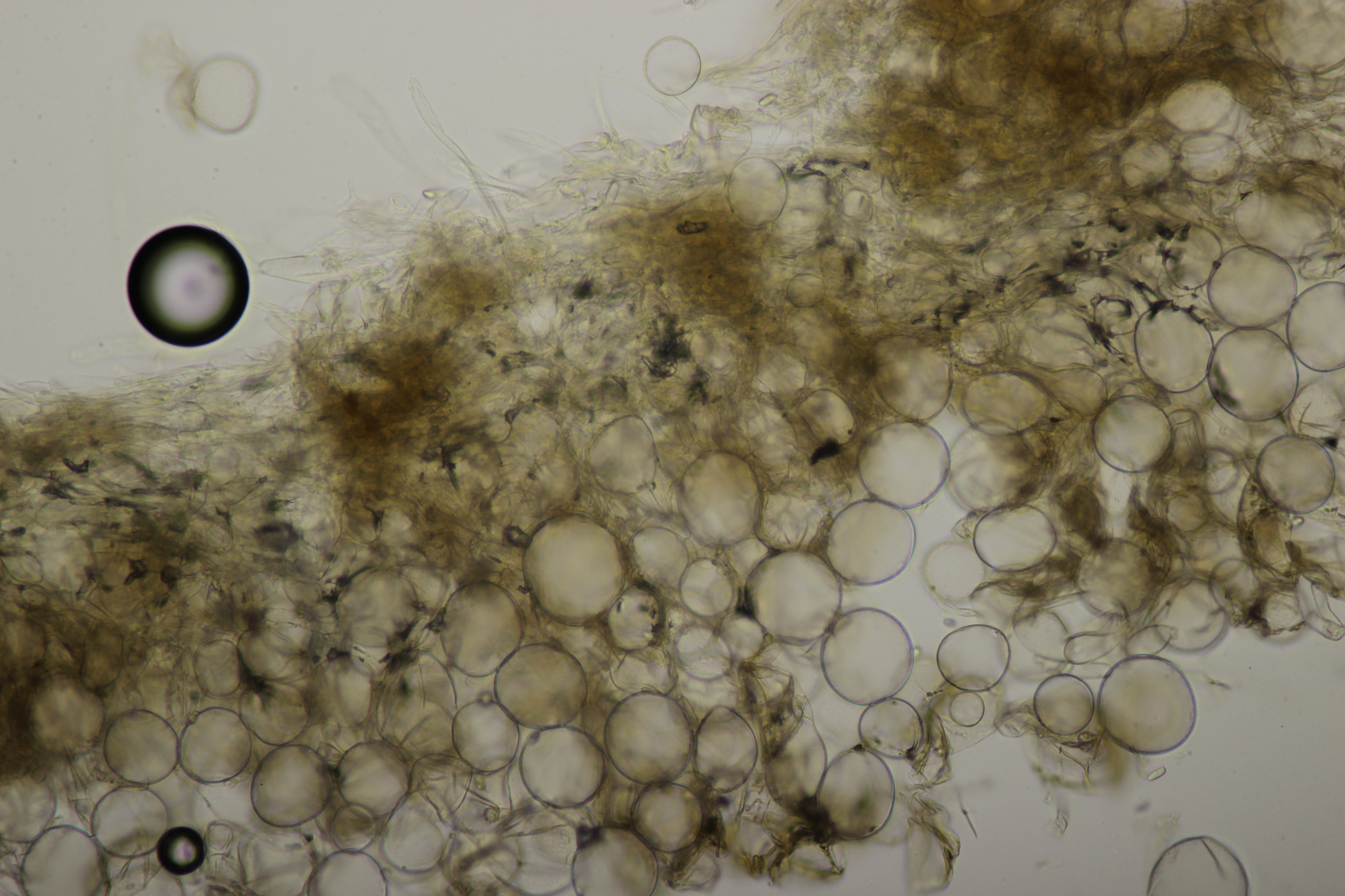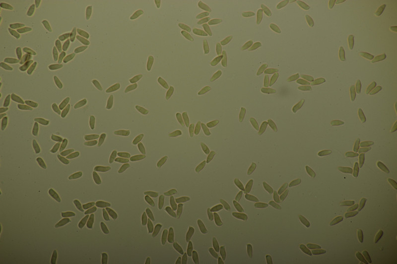 8. Cortinarius sp. unter Buche. Geruch nicht feststellbar. Mit KOH 20% erst gelb verfärbend (sowohl innen als auch außen), nach einiger Zeit dann orange-rot-braun. Mit Ammoniak die gleiche Reaktion. Sporengröße (10.5+-0.5) µm x (5.8+-0.3) µm