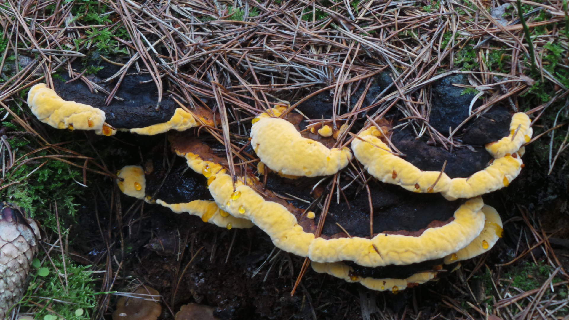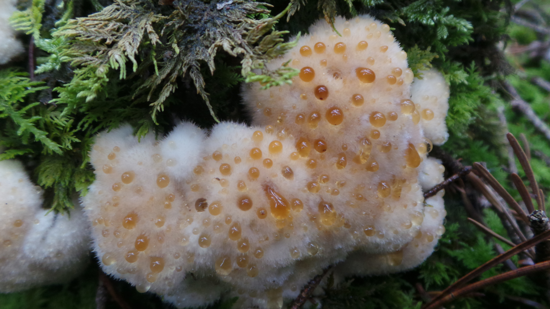 Plüsch mit Guttationstropfen: Weißer Polsterpilz (Oligoporus ptychogaster).