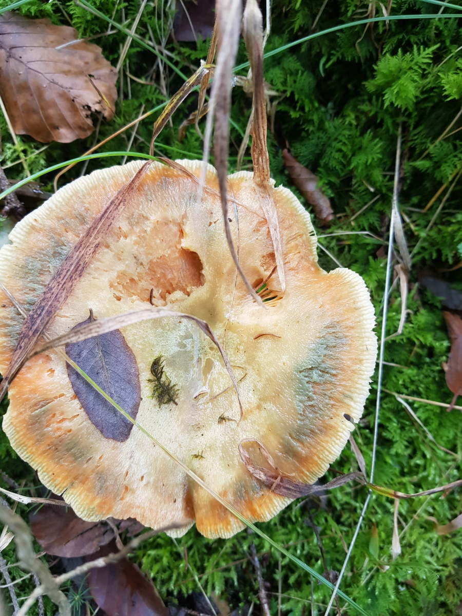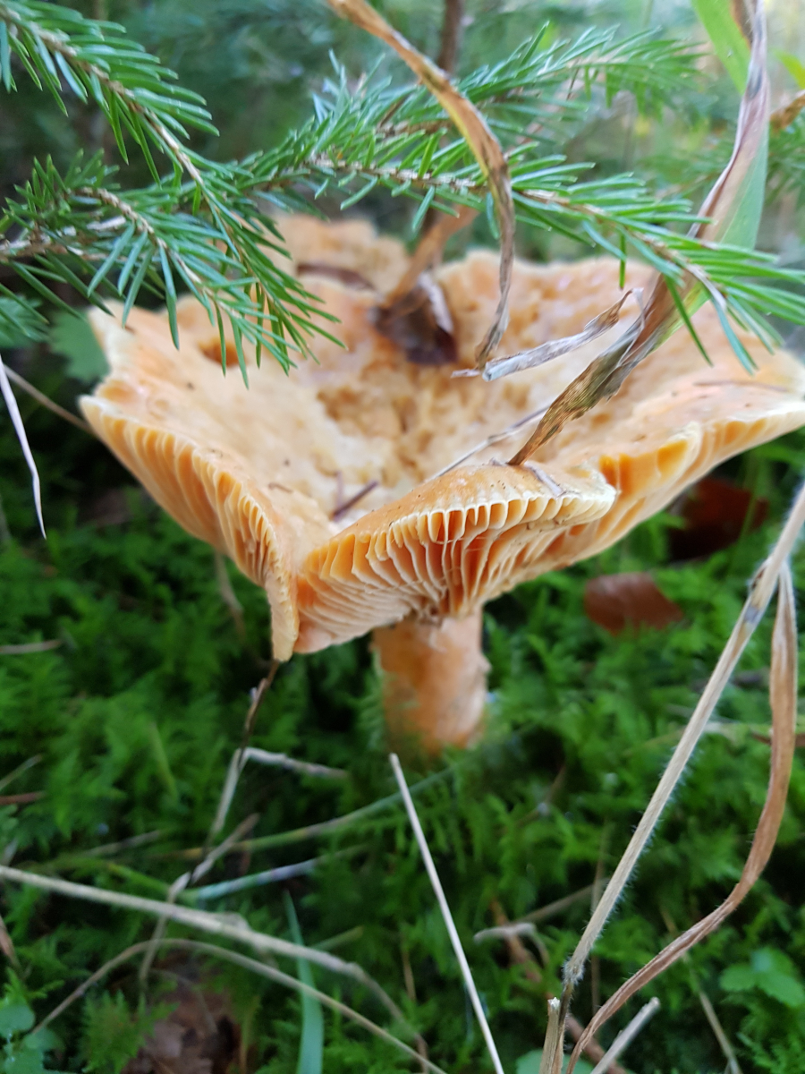 Sollte ein Fichtenreizker sein. Aber das Exemplar ist riesig. Ich würde sagen 15cm Durchmesser. Die älteren benachbarten waren auch ähnlich groß. Ich habe mich gefragt, ob man so ein Exemplar vielleicht sogar noch ernten könnte...