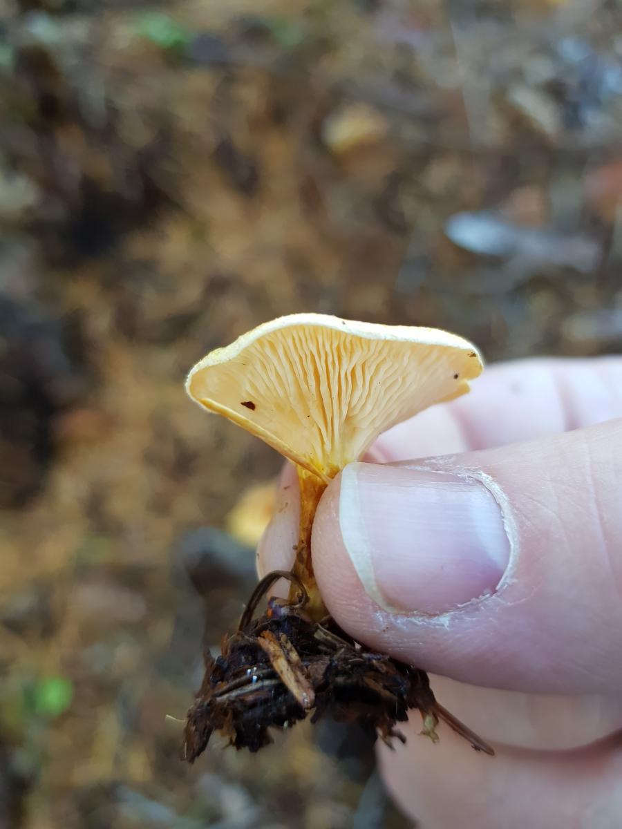 Nähe Kiefern. Sehr lichter Wald. Irgendeine Pfifferlingsart? Habe zwei Stück mitgenommen, die könnten ggf. noch in die Pfanne.