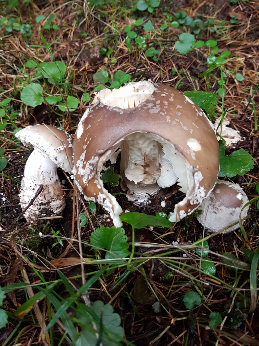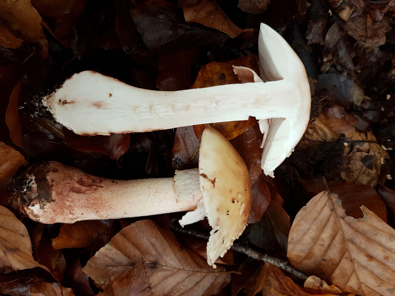 Meiner Meinung nach sind es Graue Wulstlinge. Allerdings dachte ich bis dato, dass diese kleinen Rillen/Flusen am Stiel die sogenannten ,, Bergsteigersöckchen" sind, weshalb ich auf den ersten Blick den Pantherpilz in Verdacht hatte. Als ich dann die gerieften Manschetten entdeckte, war ich leicht irritiert, weil diese den Panther ja eindeutig ausschließen.