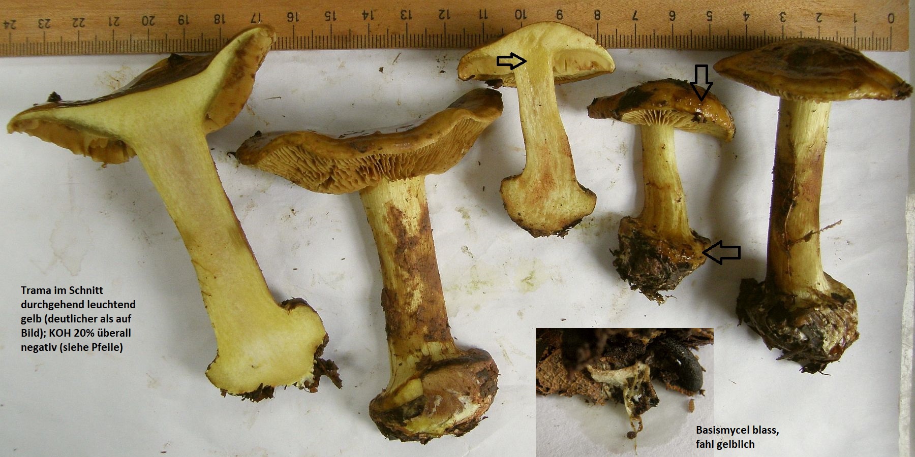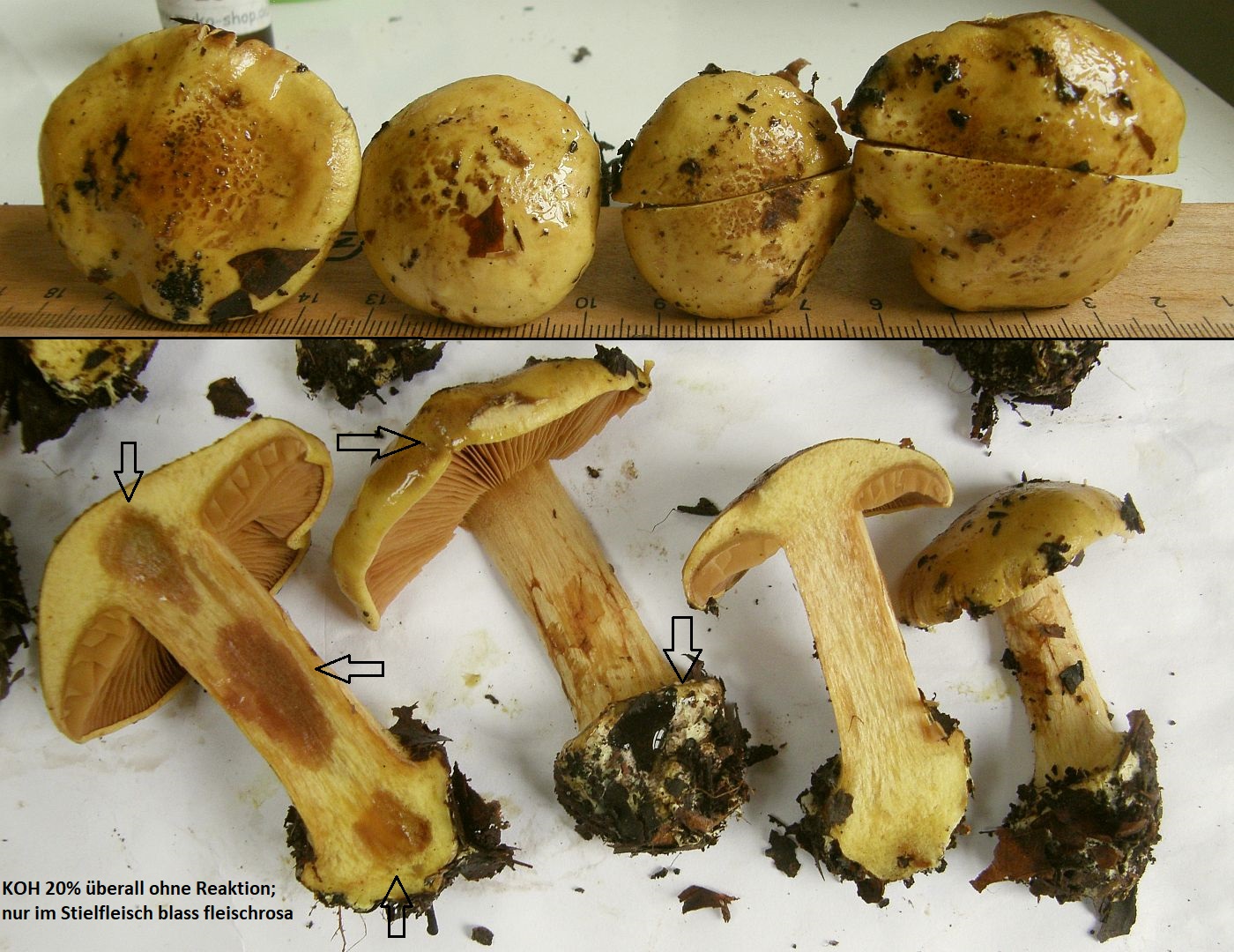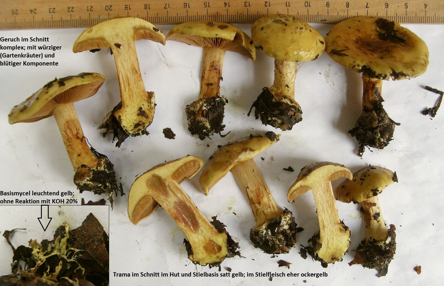 Geruch für meine Nase unspezifisch (kein Pfeffer, kein Mehl, kein Anis, kein "Malz"), nicht unangenehm; Geschmack nicht getestet; KOH überall deutlich negativ; farblich darf man die sich noch etwas greller vorstellen als auf den Bildern, vor allem was die gelbgrüne Tönung im Fleisch betrifft. Die dunkelbraunen Placken auf den Hüten sind teils anhaftende Erde, aber nur teils. Die Hutmitten sind schon recht dunkel, trüb olivbraun.