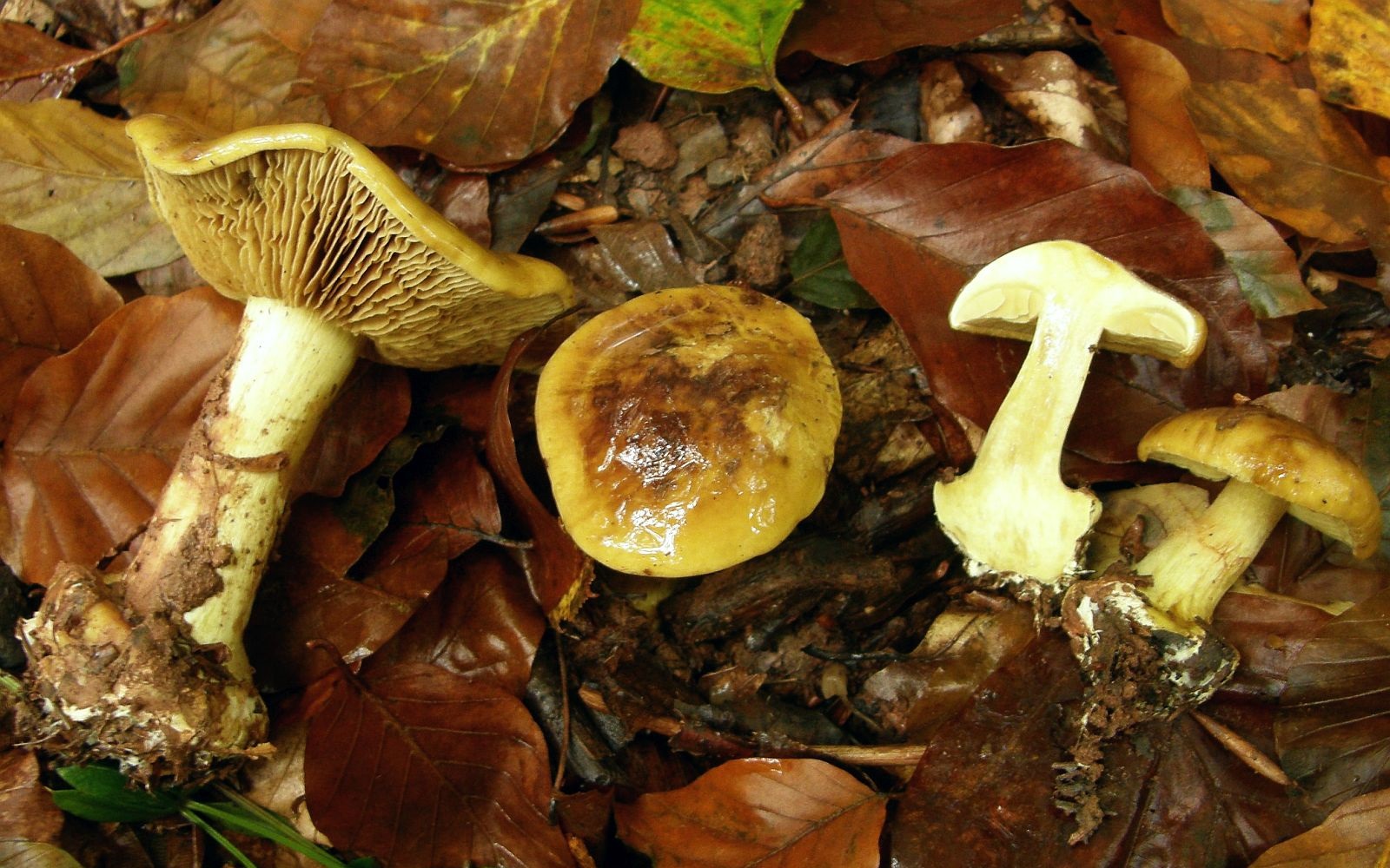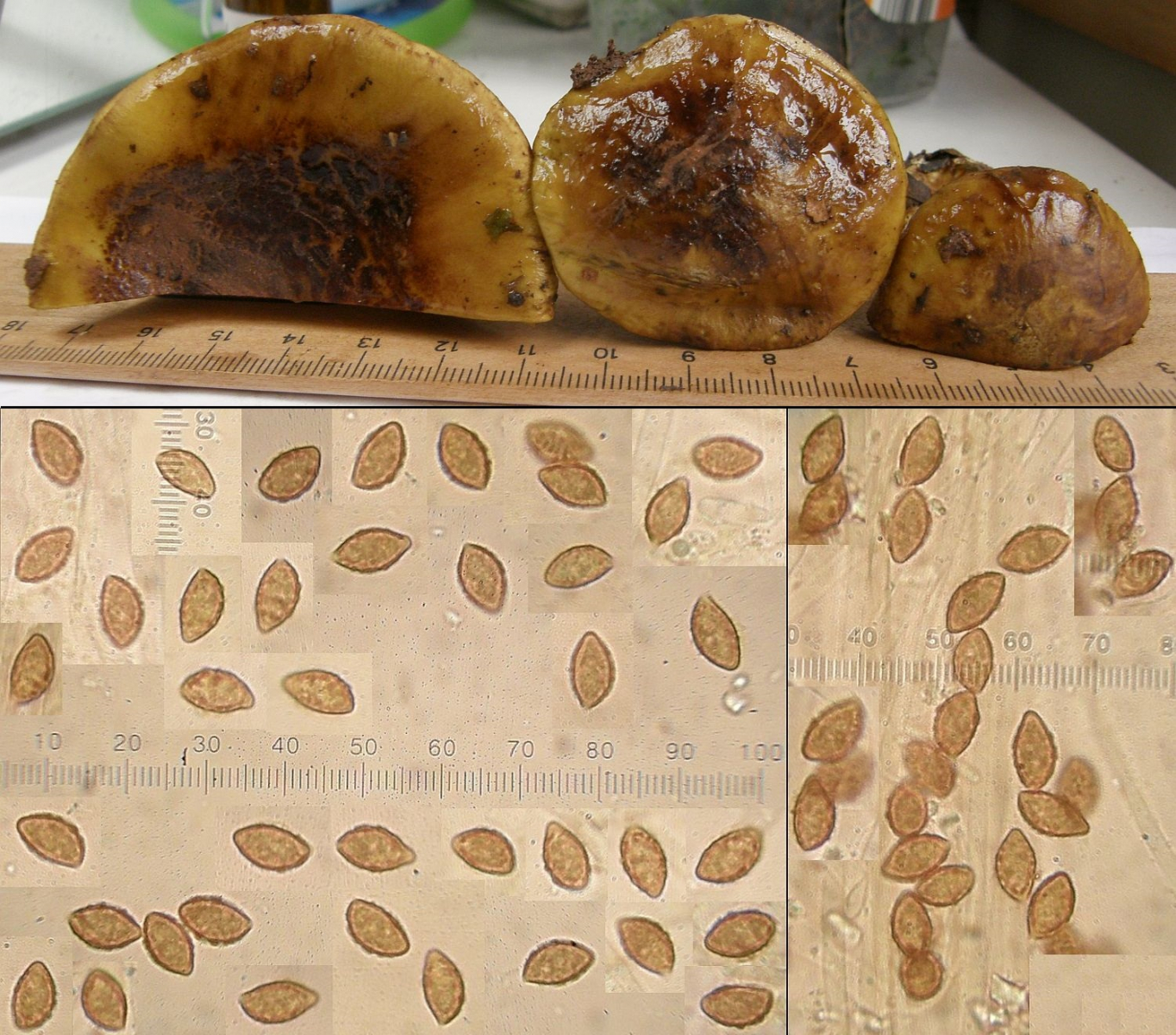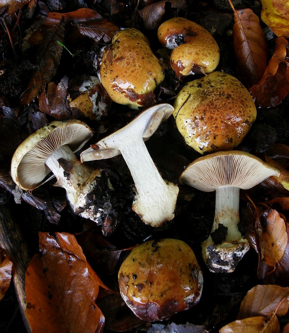 Geruch für meine Nase unspezifisch (kein Pfeffer, kein Mehl, kein Anis, kein "Malz"), nicht unangenehm; Geschmack nicht getestet; KOH überall deutlich negativ; farblich darf man die sich noch etwas greller vorstellen als auf den Bildern, vor allem was die gelbgrüne Tönung im Fleisch betrifft. Die dunkelbraunen Placken auf den Hüten sind teils anhaftende Erde, aber nur teils. Die Hutmitten sind schon recht dunkel, trüb olivbraun.
