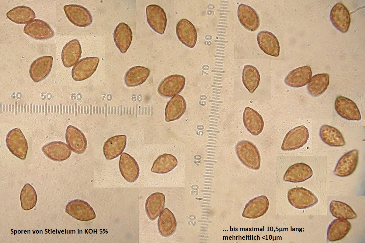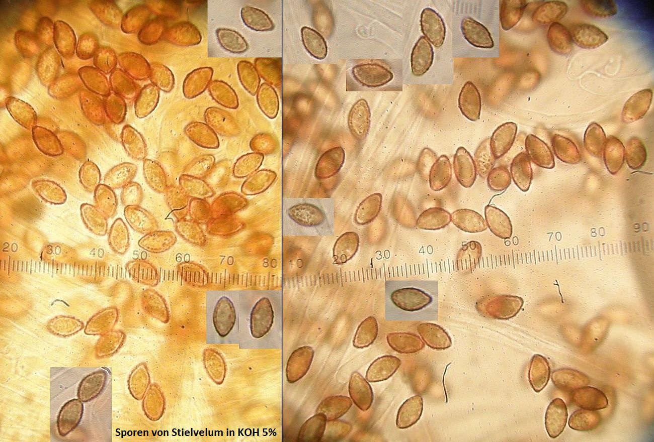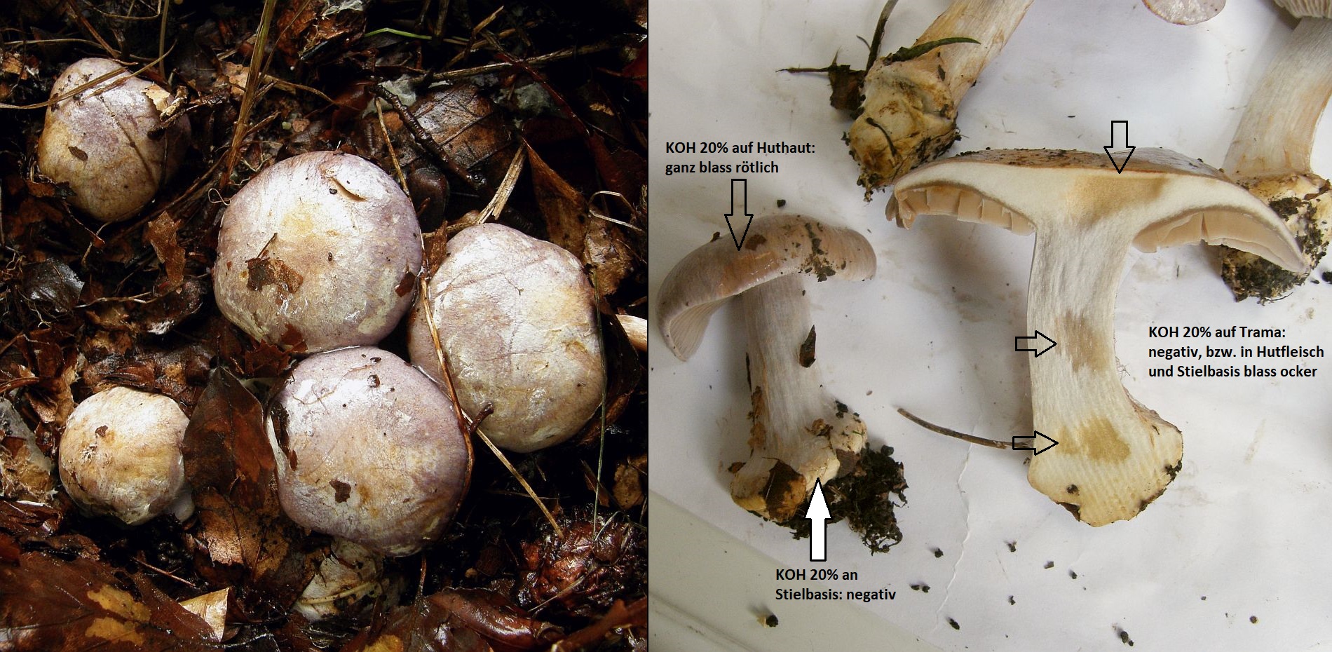 Bemerkenswert aber ist das (jung) blaue Hutfleisch, blass aber deutlich, direkt über den Lamellen teils sogar tief blau, sowie die KOH - Reaktion: sofort dunkelrot auf dem Hutrand + sofort dunkelrot / fast schwarz auf dem Knollenrand und rosa im Stielfleisch, Hutfleisch und Stielbasis eher dunkel magenta. Leider habe ich nicht beobachtet, wie sich die Verfärbung über einen längeren Zeitraum entwickelt. Wenn ich mich recht erinnere, ging das aber nie wieder weg.