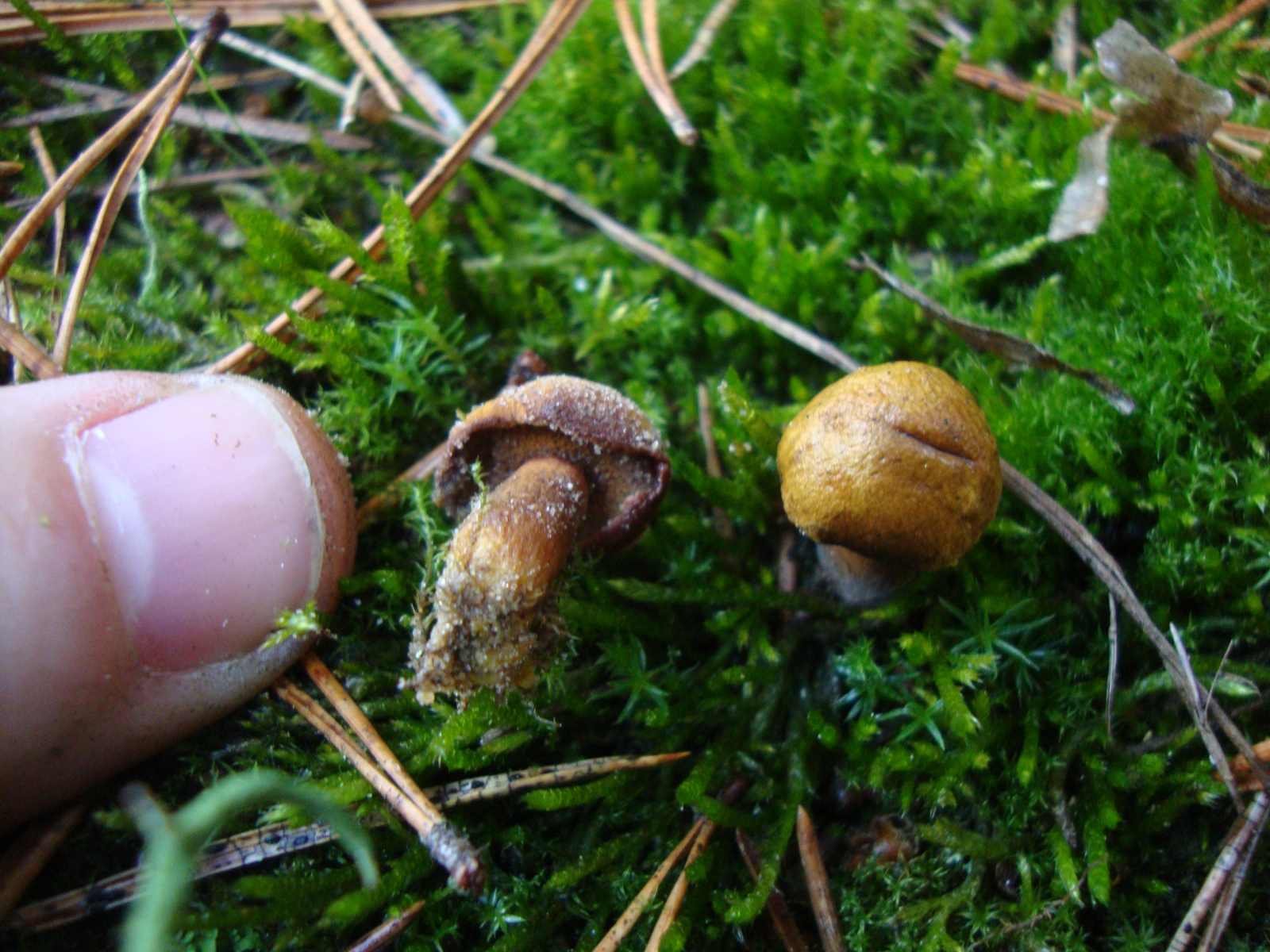 Mein Daumennagel ist keine 2 cm breit, der Hutdurchmesser also lediglich ca. 1 cm, der des anhängenden Baby-Fruchtkörpers entsprechend nur 1 mm.