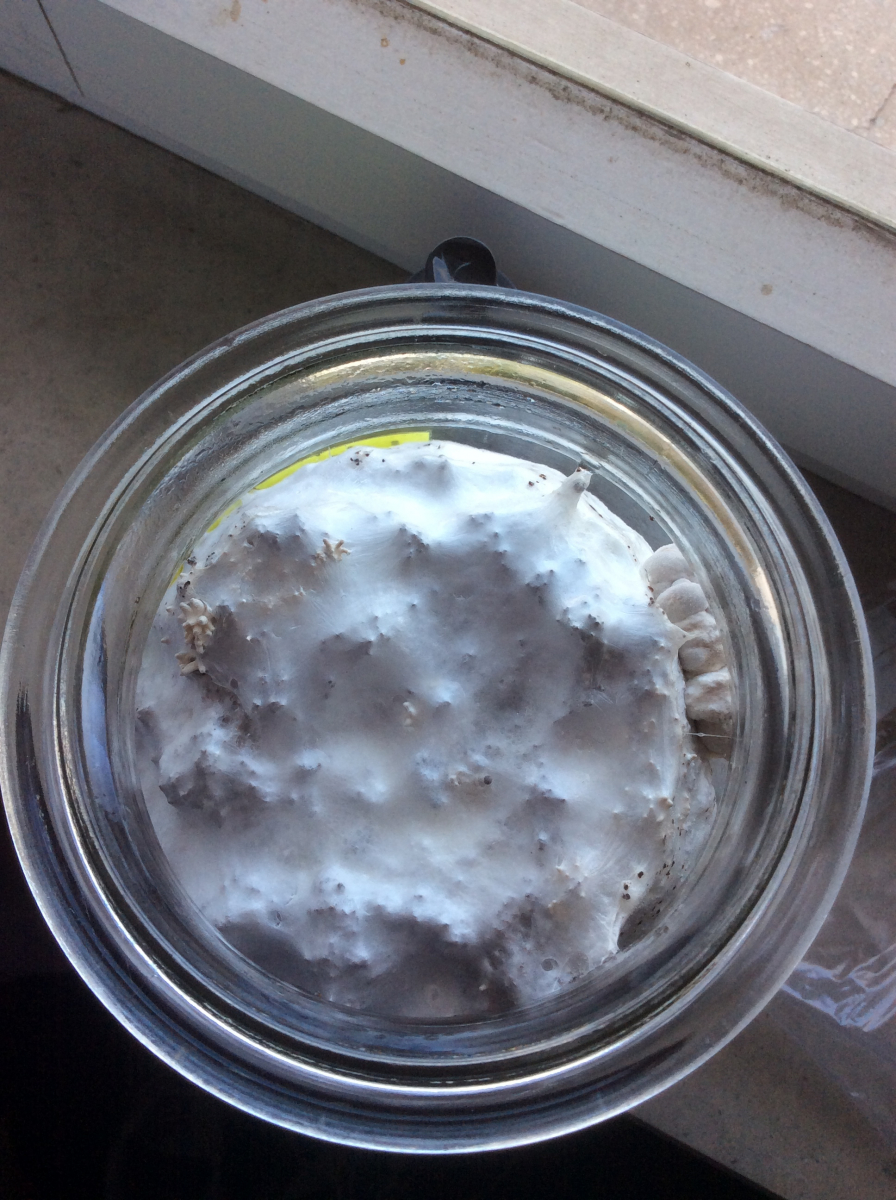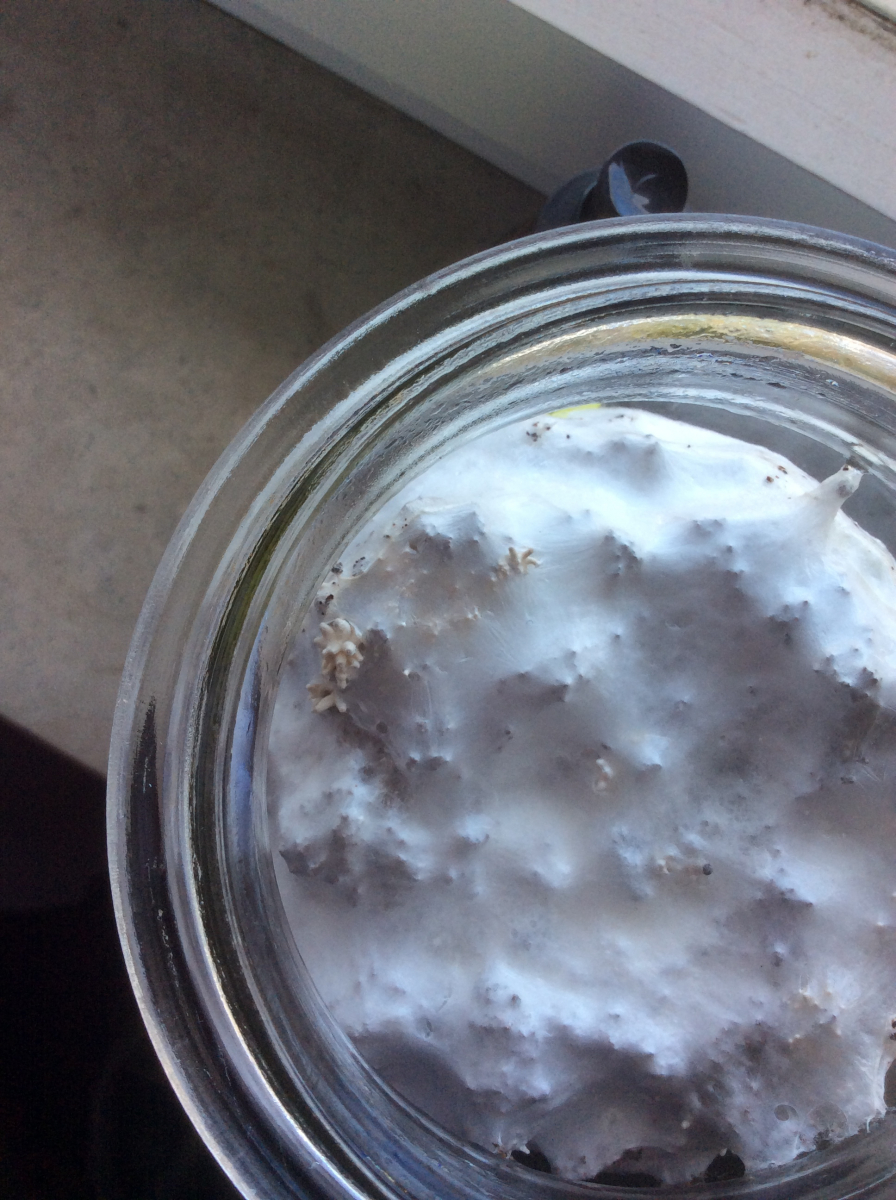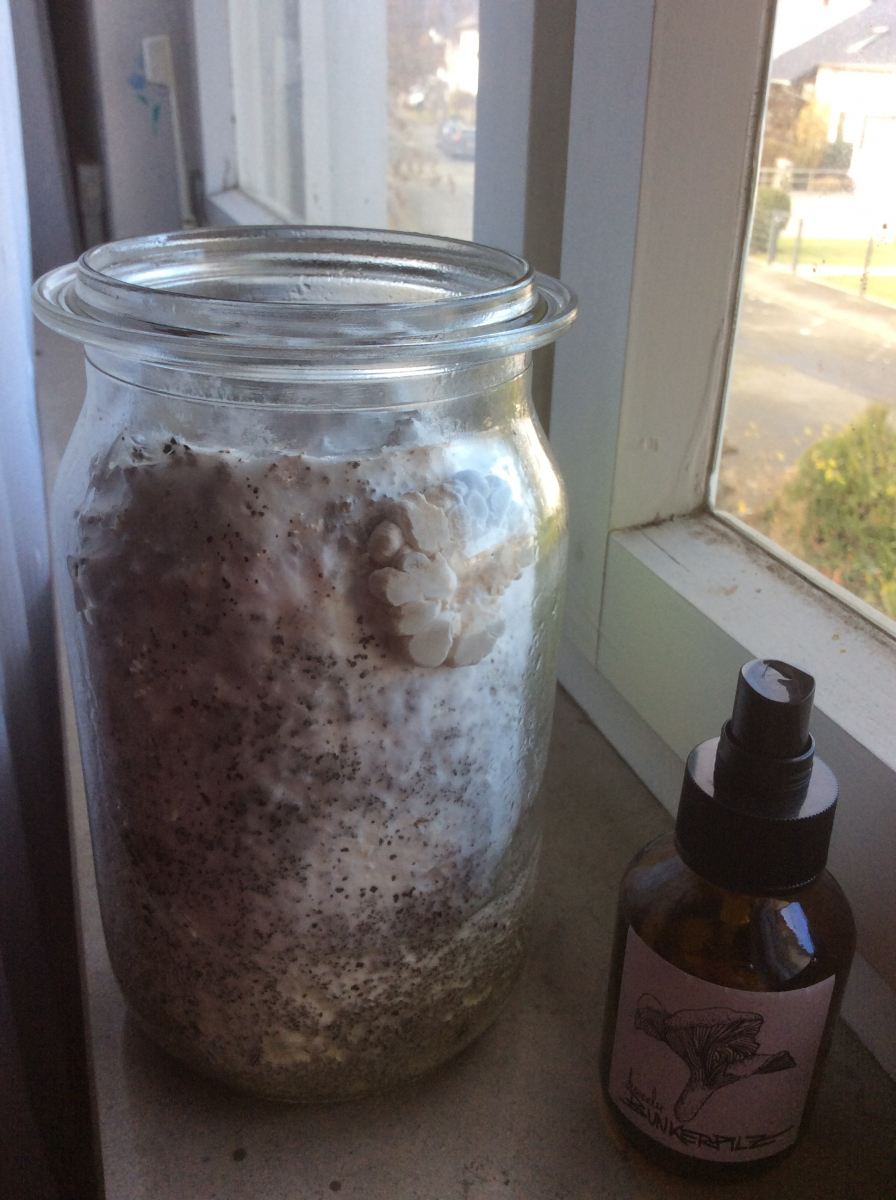 Meine Weckglas-Mini-Kaffeesatz-Austernkultur zeigt erste Primordien und sogar schon einen "Bobbel" von Fruchtkörperchen!