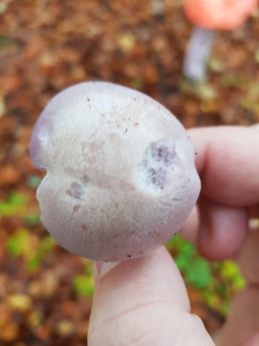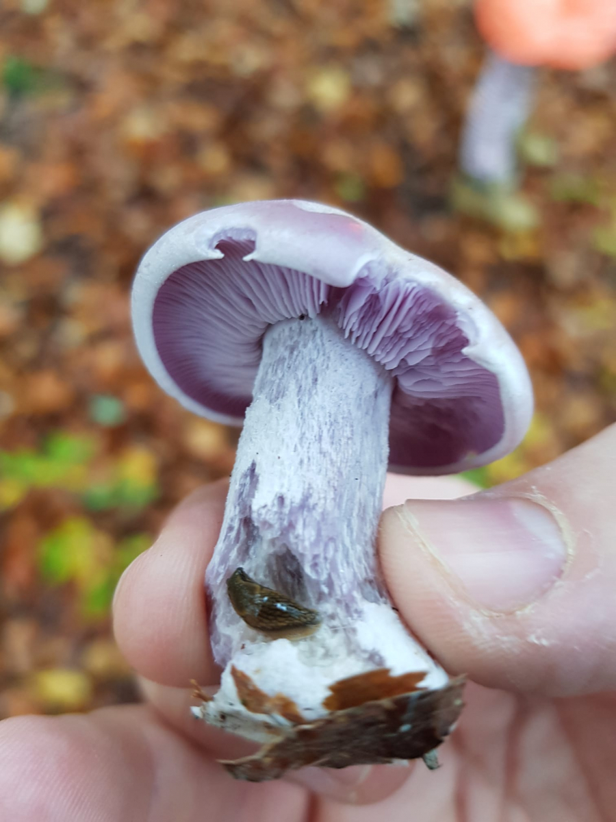 Den violetten Lacktrichterling habe ich wegen der Lamellen bereits ausgeschlossen. Vielleicht ein violetter Rötelritterling? Sporen müssten weiß sein... da gibt er bis jetzt aber nicht viel her.