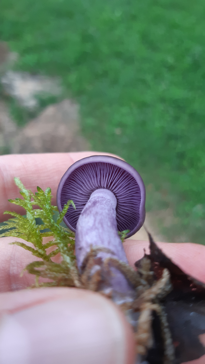 Den violetten Lacktrichterling habe ich wegen der Lamellen bereits ausgeschlossen. Vielleicht ein violetter Rötelritterling? Sporen müssten weiß sein... da gibt er bis jetzt aber nicht viel her.