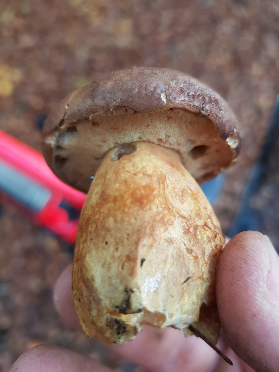 Die wichtigere Frage: sind die noch frisch genug? Ggf. haben die einen leichten Frostschaden... Die eine Marone ist schon etwas bräunlich am Schwamm, hat aber noch sehr festes Fleisch. Die andere habe ich erst für einen Steinpilz gehalten wegen dem dicken Stiel und weil der Schwamm nicht gebläut hat. Ca. zwei Stunden später wurde er dann doch noch blau.