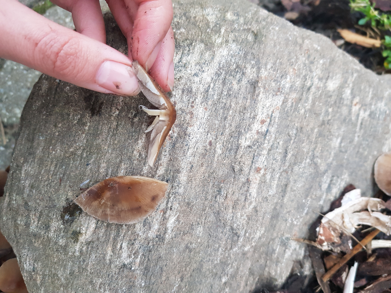 Der Stiel ist hohl, leicht vom Hut trennbar und sehr zerbrechlich, weshalb die Basis nicht auf dem Foto ist. Die Lamellen sind angeheftet. Der Geruch war am ehesten pilzig.