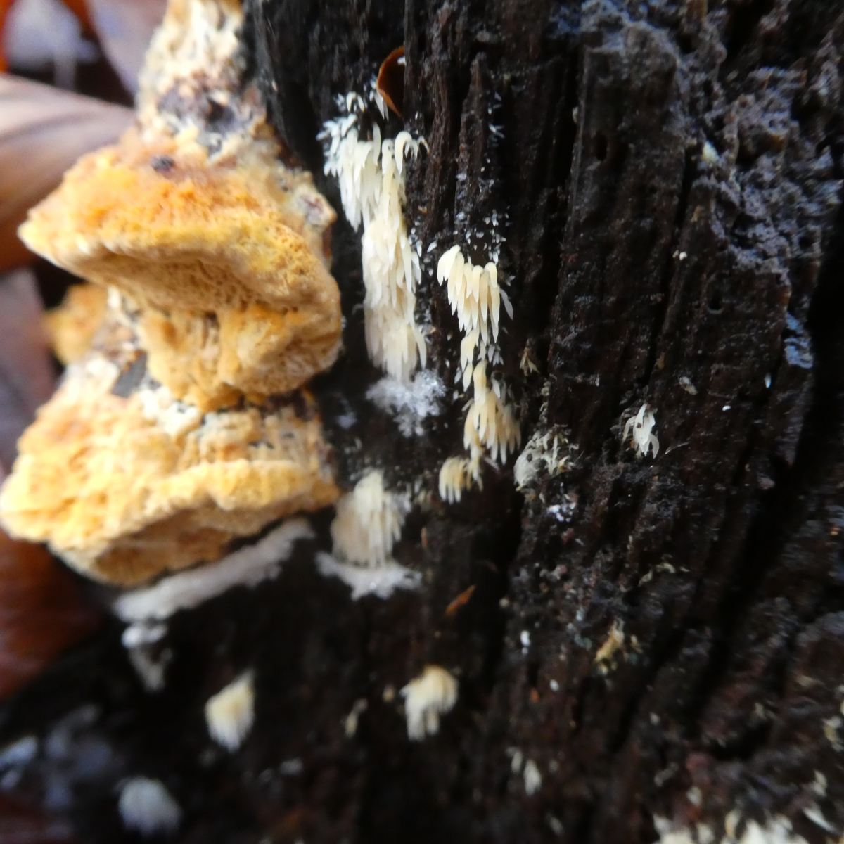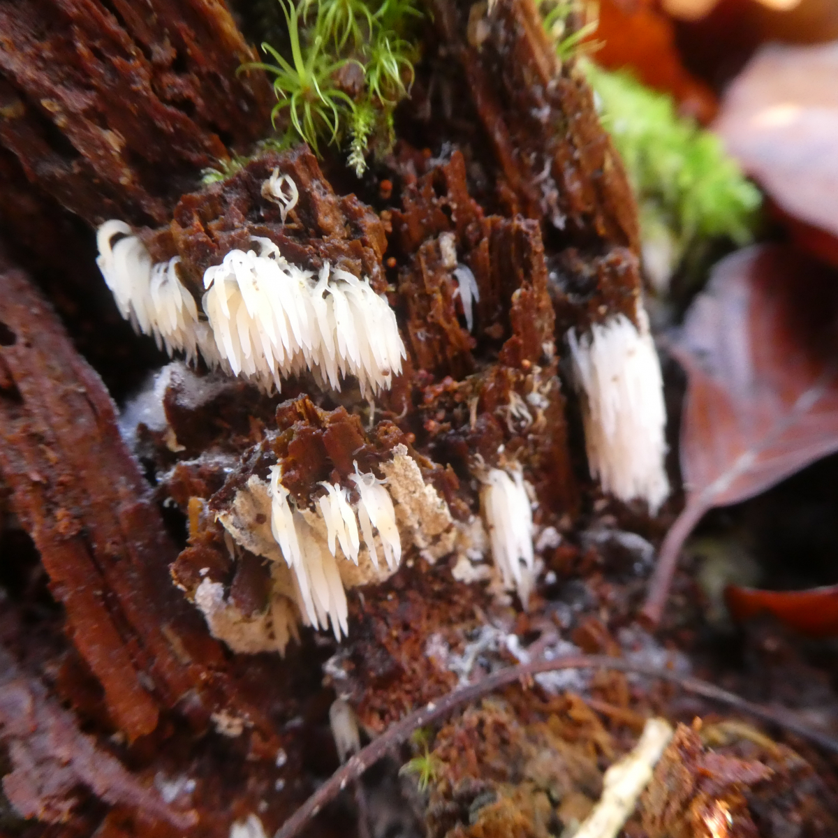 Funddaten: 10.11.2019, Altmühltal, Mischwald mit überwiegend Rotbuchen. Die einzelnen Stacheln/Fäden oder wie auch immer man dies bezeichnet sind ca. 0,8 cm lang. Einen kleinen Büschel dieses Pilzes habe ich auf einem Stückchen Holz mitgenommen. Bessere Fotos habe ich leider nicht.