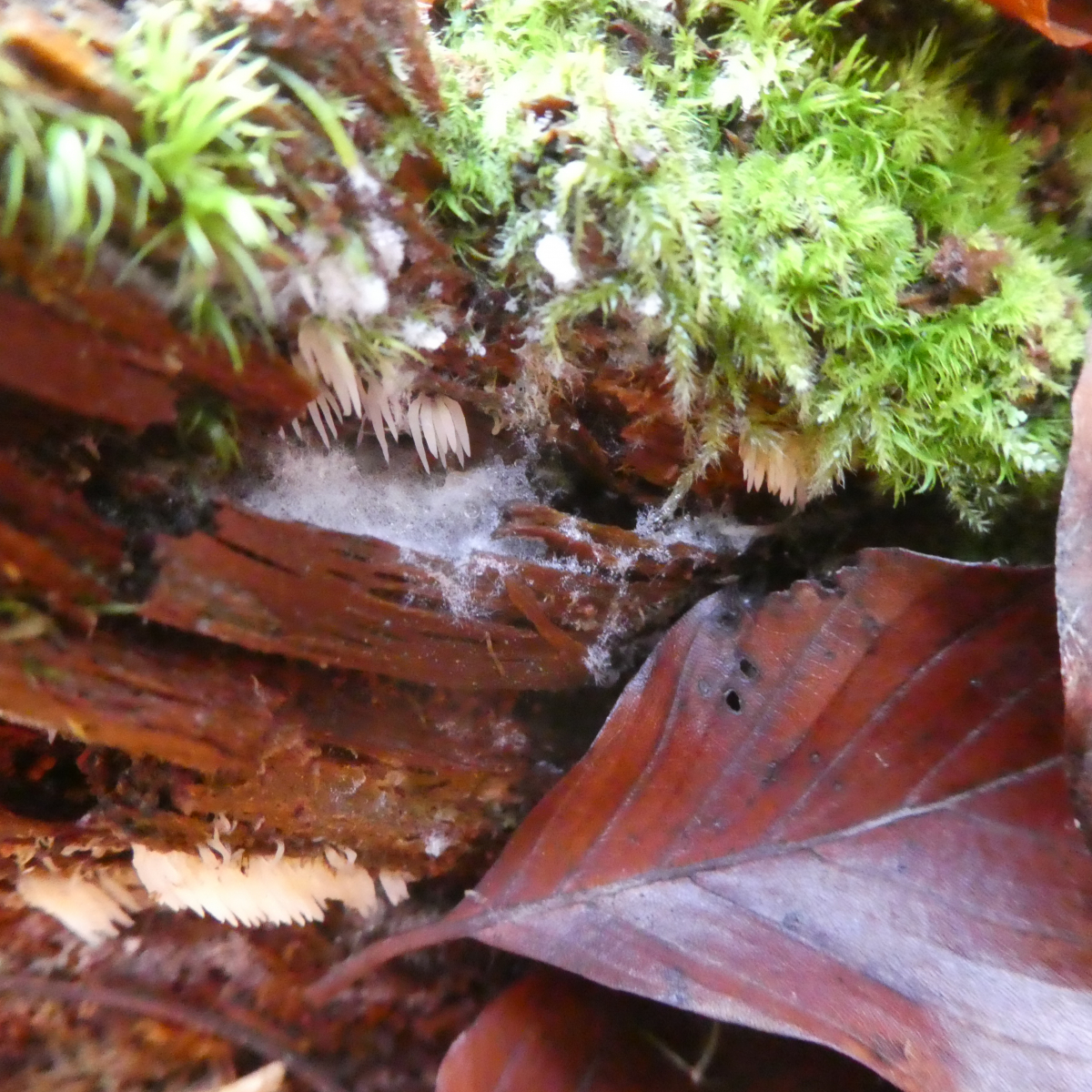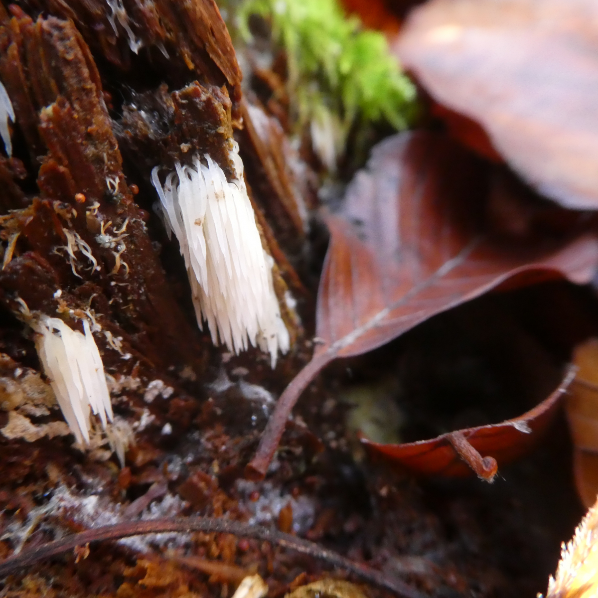 Funddaten: 10.11.2019, Altmühltal, Mischwald mit überwiegend Rotbuchen. Die einzelnen Stacheln/Fäden oder wie auch immer man dies bezeichnet sind ca. 0,8 cm lang. Einen kleinen Büschel dieses Pilzes habe ich auf einem Stückchen Holz mitgenommen. Bessere Fotos habe ich leider nicht.